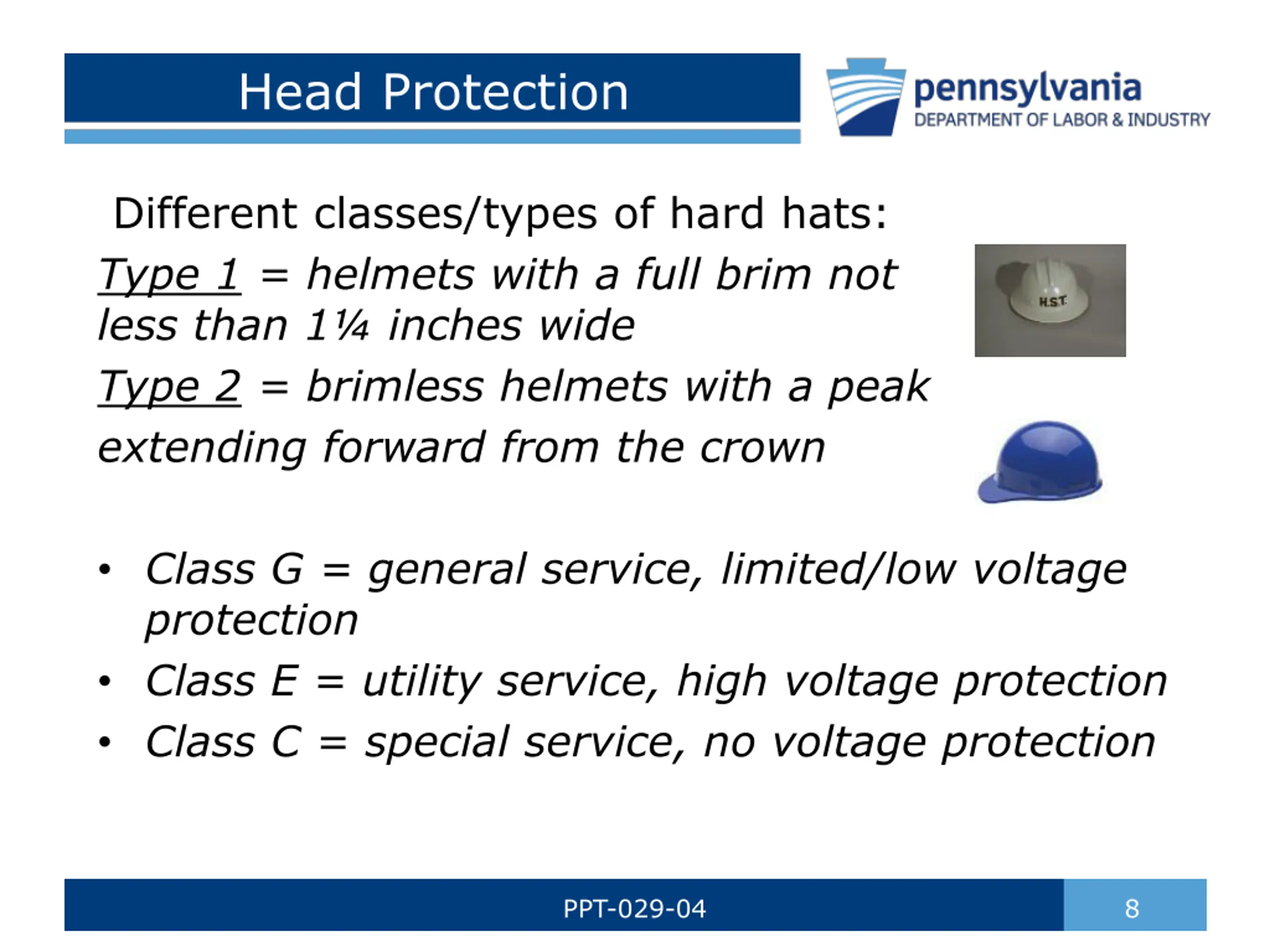 Head Protection Different classes/types of hard hats: Type 1 = helmets with a full brim not less than 1 inches wide Type 2 = brimless helmets with a peak extending forward from the crown Class G = general service, limited/low voltage protection Class E = utility service, high voltage protection Class C = special service, no voltage protection PPT-029-04 8