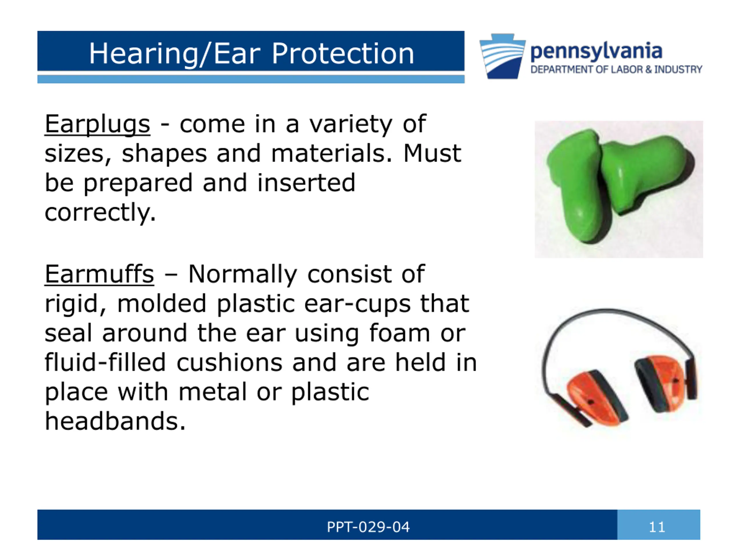 Hearing/Ear Protection Earplugs - come in a variety of sizes, shapes and materials. Must be prepared and inserted correctly. Earmuffs Normally consist of rigid, molded plastic ear-cups that seal around the ear using foam or fluid-filled cushions and are held in place with metal or plastic headbands. PPT-029-04 11