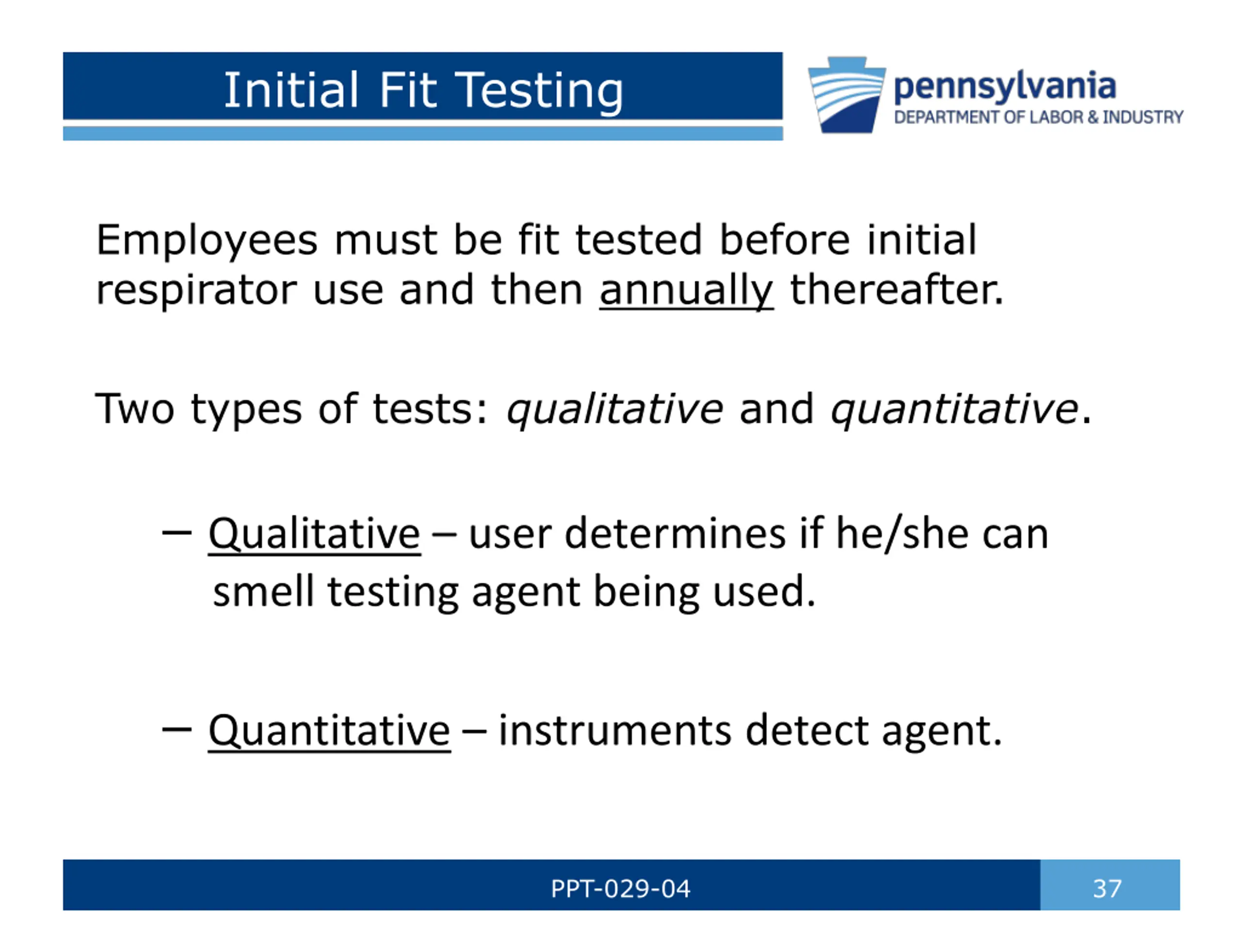 Initial Fit Testing Employees must be fit tested before initial respirator use and then annually thereafter. Two types of tests: qualitative and quantitative. Qualitative user determines if he/she can smell testing agent being used. Quantitative instruments detect agent. PPT-029-04 37