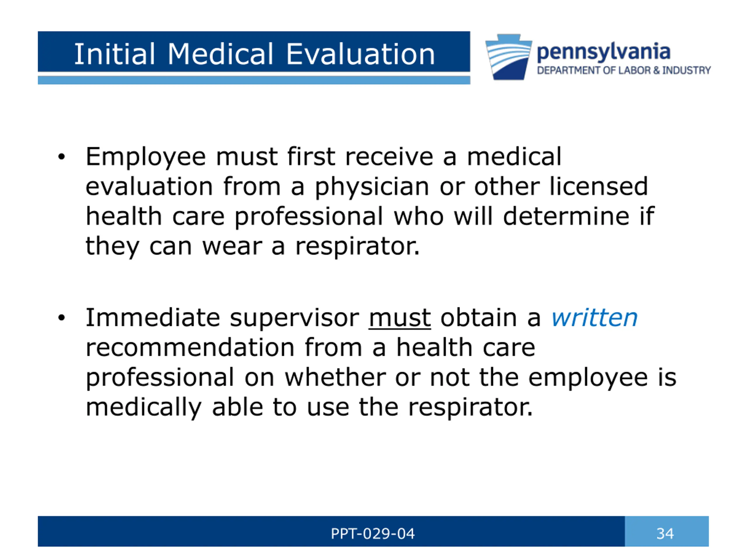 Initial Medical Evaluation Employee must first receive a medical evaluation from a physician or other licensed health care professional who will determine if they can wear a respirator. Immediate supervisor must obtain a written recommendation from a health care professional on whether or not the employee is medically able to use the respirator. PPT-029-04 34