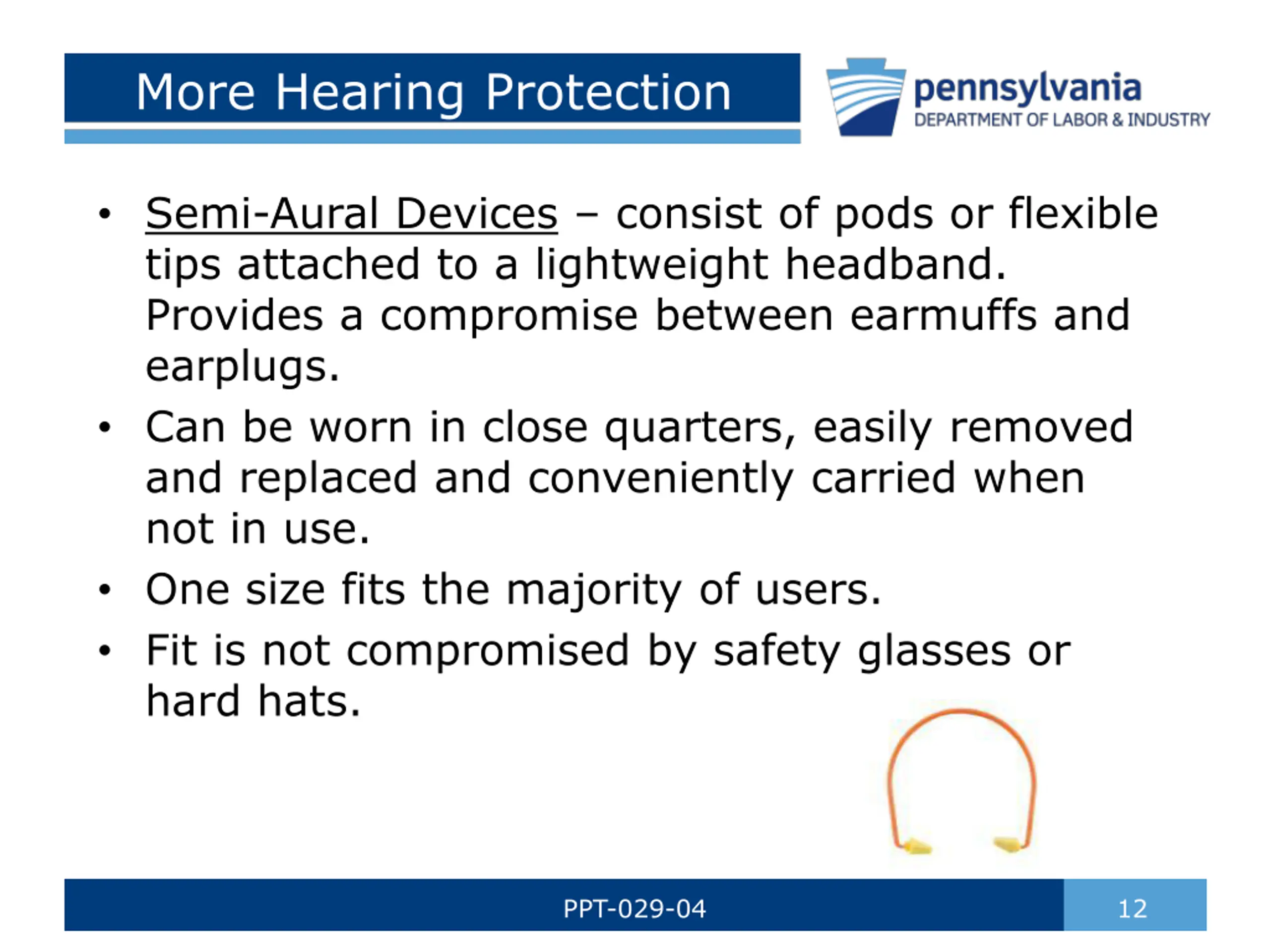 More Hearing Protection Semi-Aural Devices consist of pods or flexible tips attached to a lightweight headband. Provides a compromise between earmuffs and earplugs. Can be worn in close quarters, easily removed and replaced and conveniently carried when not in use. One size fits the majority of users. Fit is not compromised by safety glasses or hard hats. PPT-029-04 12
