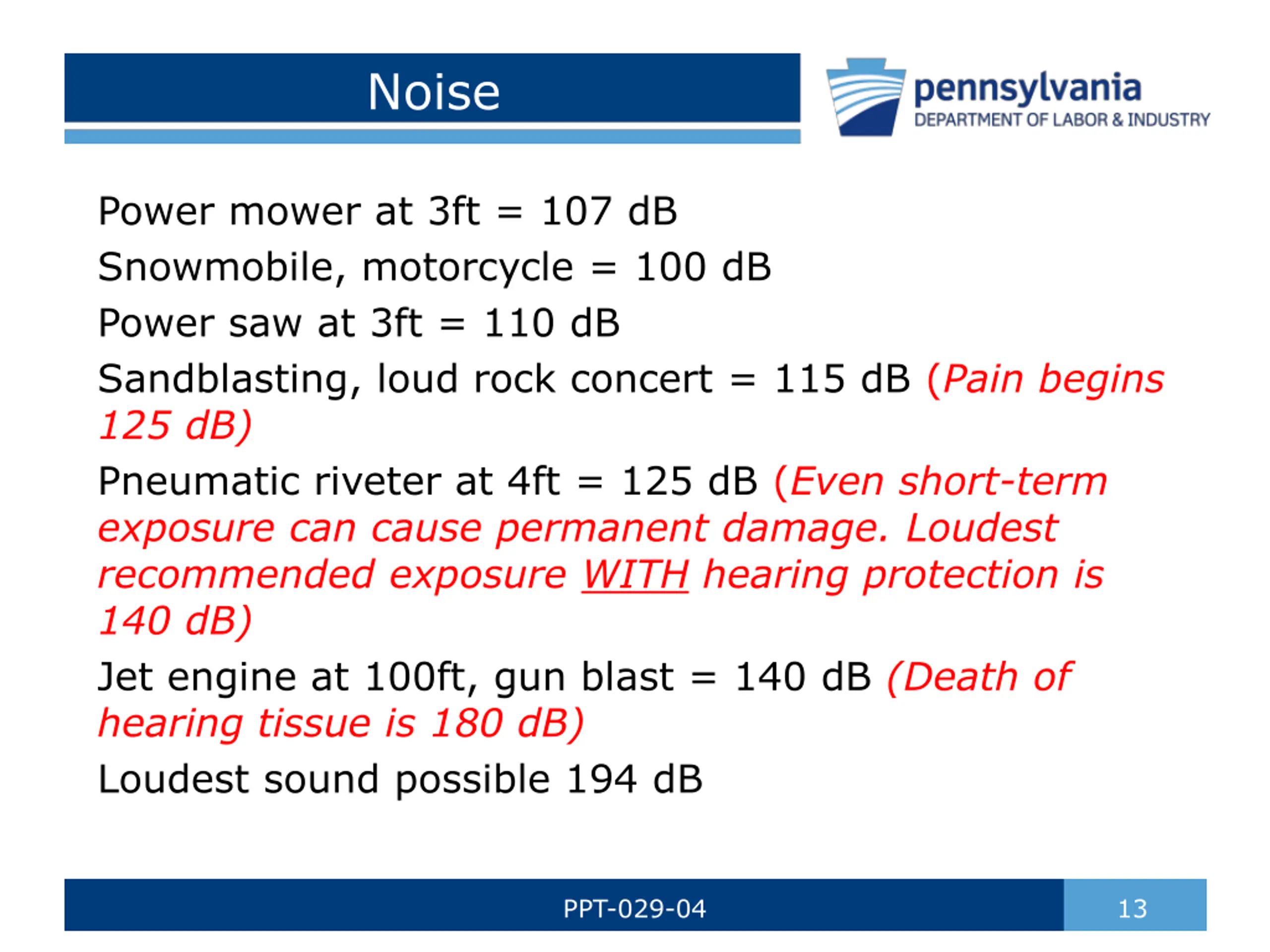 Noise Power mower at 3ft = 107 dB Snowmobile, motorcycle = 100 dB Power saw at 3ft = 110 dB Sandblasting, loud rock concert = 115 dB (Pain begins 125 dB) Pneumatic riveter at 4ft = 125 dB (Even short-term exposure can cause permanent damage. Loudest recommended exposure WITH hearing protection is 140 dB) Jet engine at 100ft, gun blast = 140 dB (Death of hearing tissue is 180 dB) Loudest sound possible 194 dB PPT-029-04 13