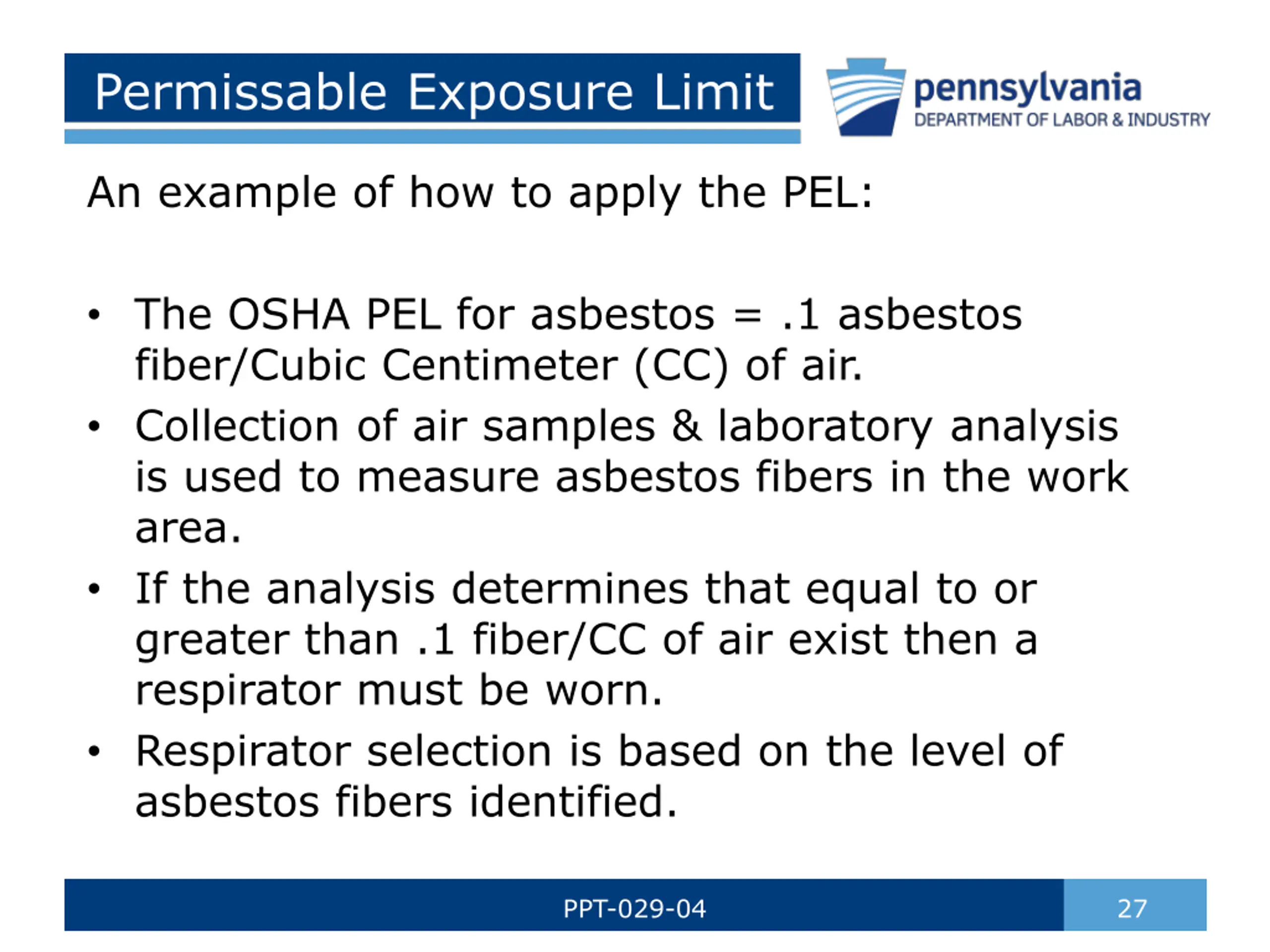 Permissable Exposure Limit An example of how to apply the PEL: The OSHA PEL for asbestos = .1 asbestos fiber/Cubic Centimeter (CC) of air. Collection of air samples & laboratory analysis is used to measure asbestos fibers in the work area. If the analysis determines that equal to or greater than .1 fiber/CC of air exist then a respirator must be worn. Respirator selection is based on the level of asbestos fibers identified. PPT-029-04 27