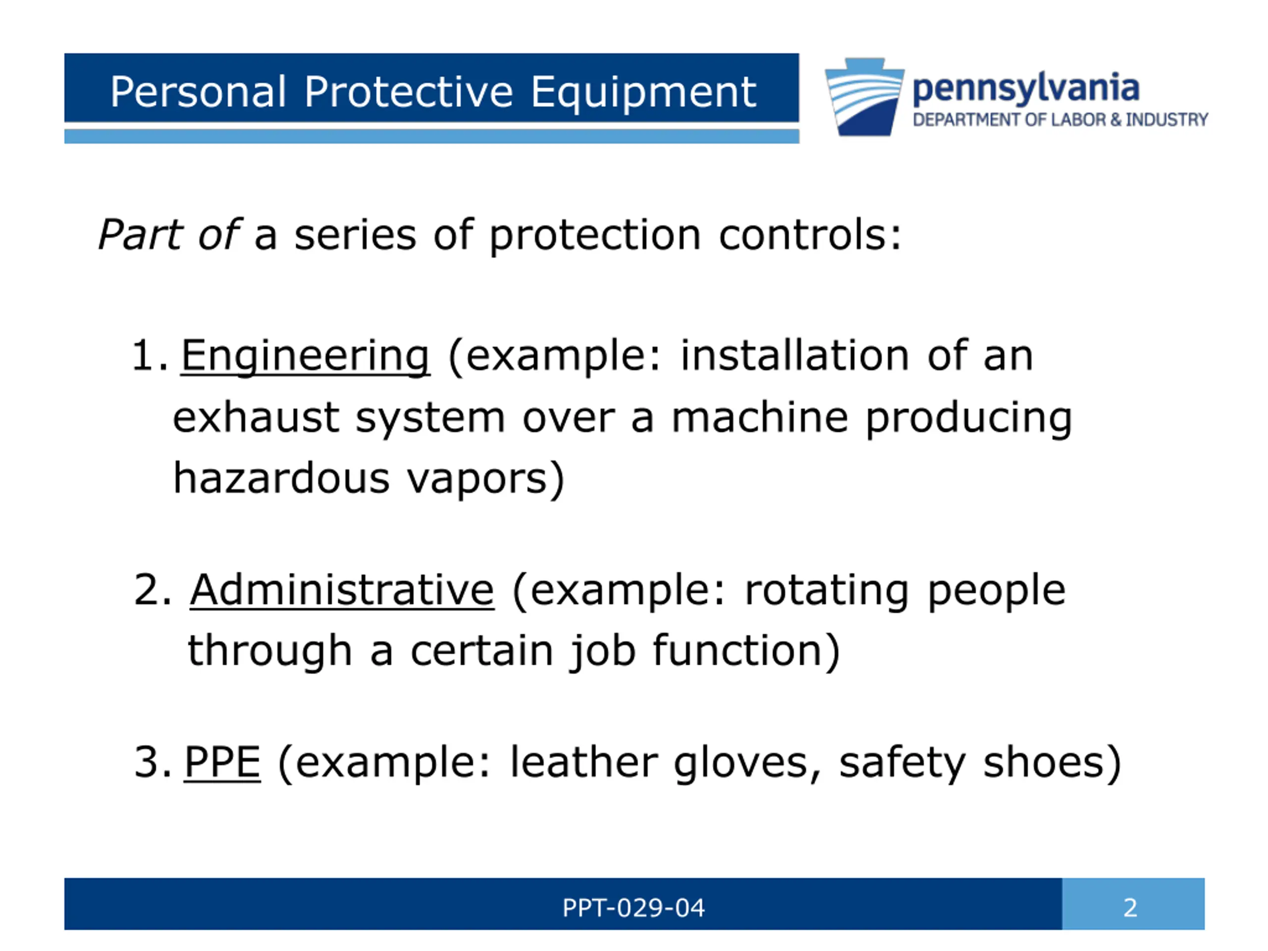Personal Protective Equipment Part of a series of protection controls: 1.Engineering (example: installation of an exhaust system over a machine producing hazardous vapors) 2. Administrative (example: rotating people through a certain job function) 3.PPE (example: leather gloves, safety shoes) PPT-029-04 2