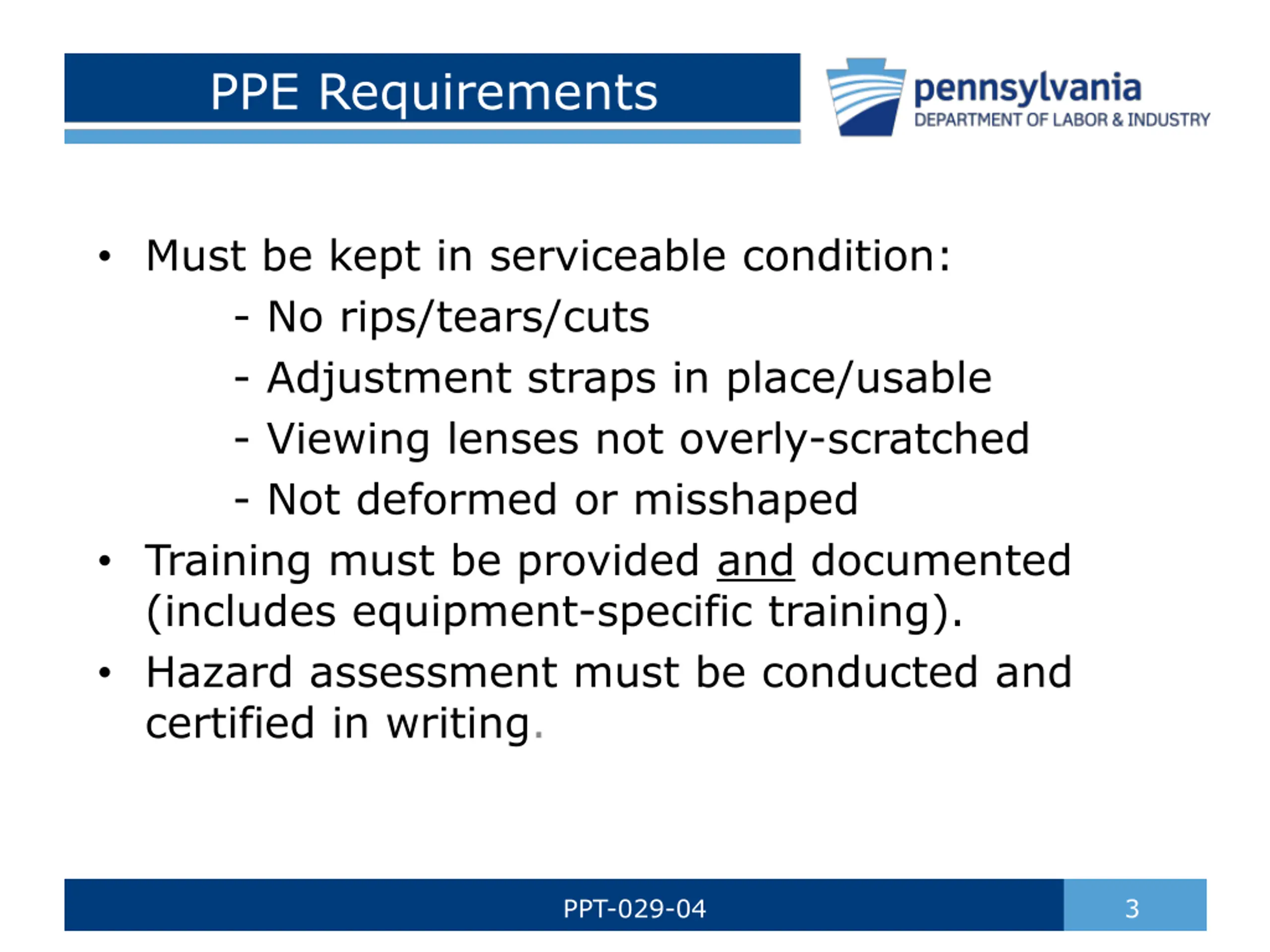 PPE Requirements Must be kept in serviceable condition: - No rips/tears/cuts - Adjustment straps in place/usable - Viewing lenses not overly-scratched - Not deformed or misshaped Training must be provided and documented (includes equipment-specific training). Hazard assessment must be conducted and certified in writing. PPT-029-04 3