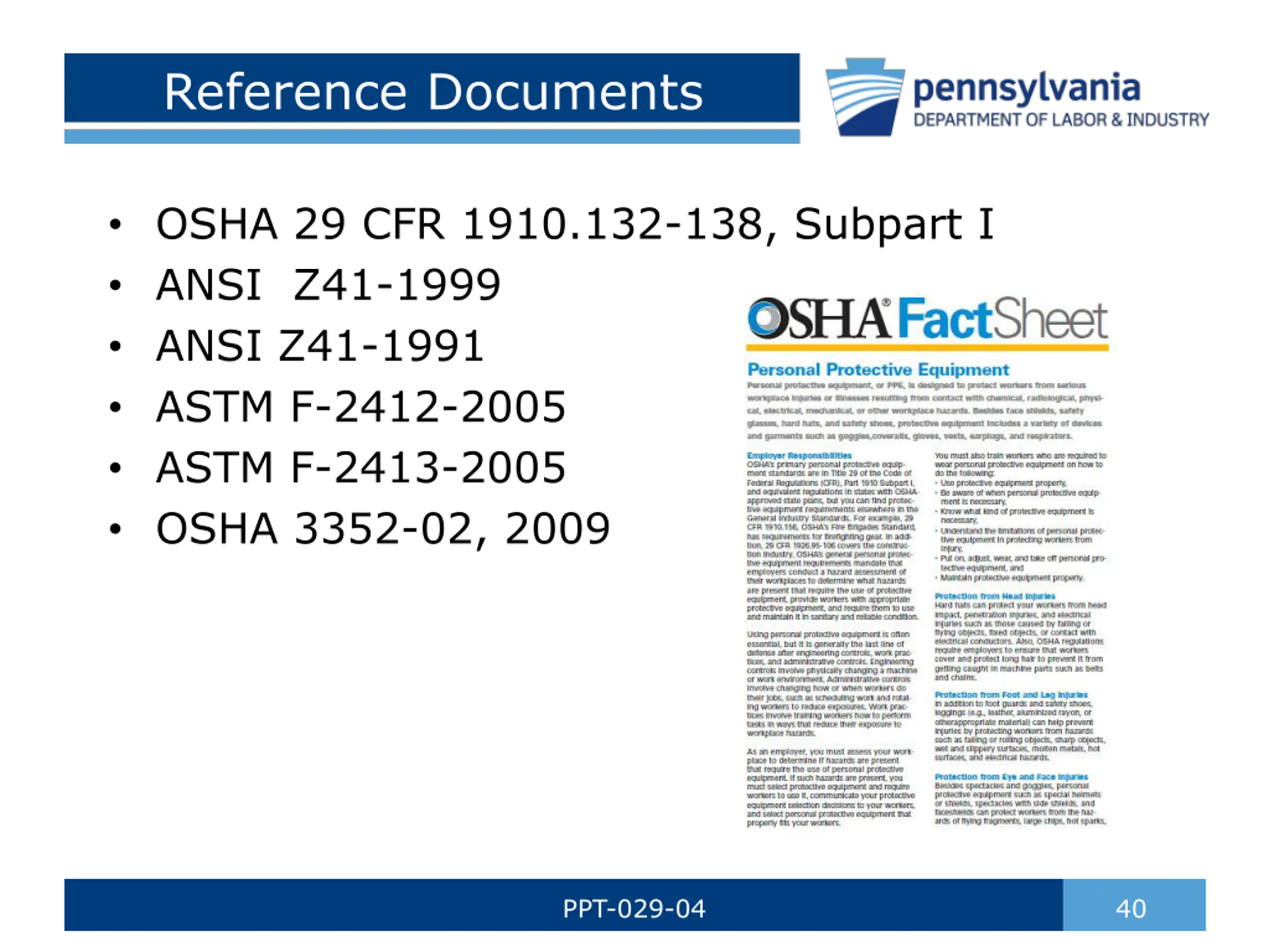Reference Documents OSHA 29 CFR 1910.132-138, Subpart I ANSI Z41-1999 ANSI Z41-1991 ASTM F-2412-2005 ASTM F-2413-2005 OSHA 3352-02, 2009 PPT-029-04 40