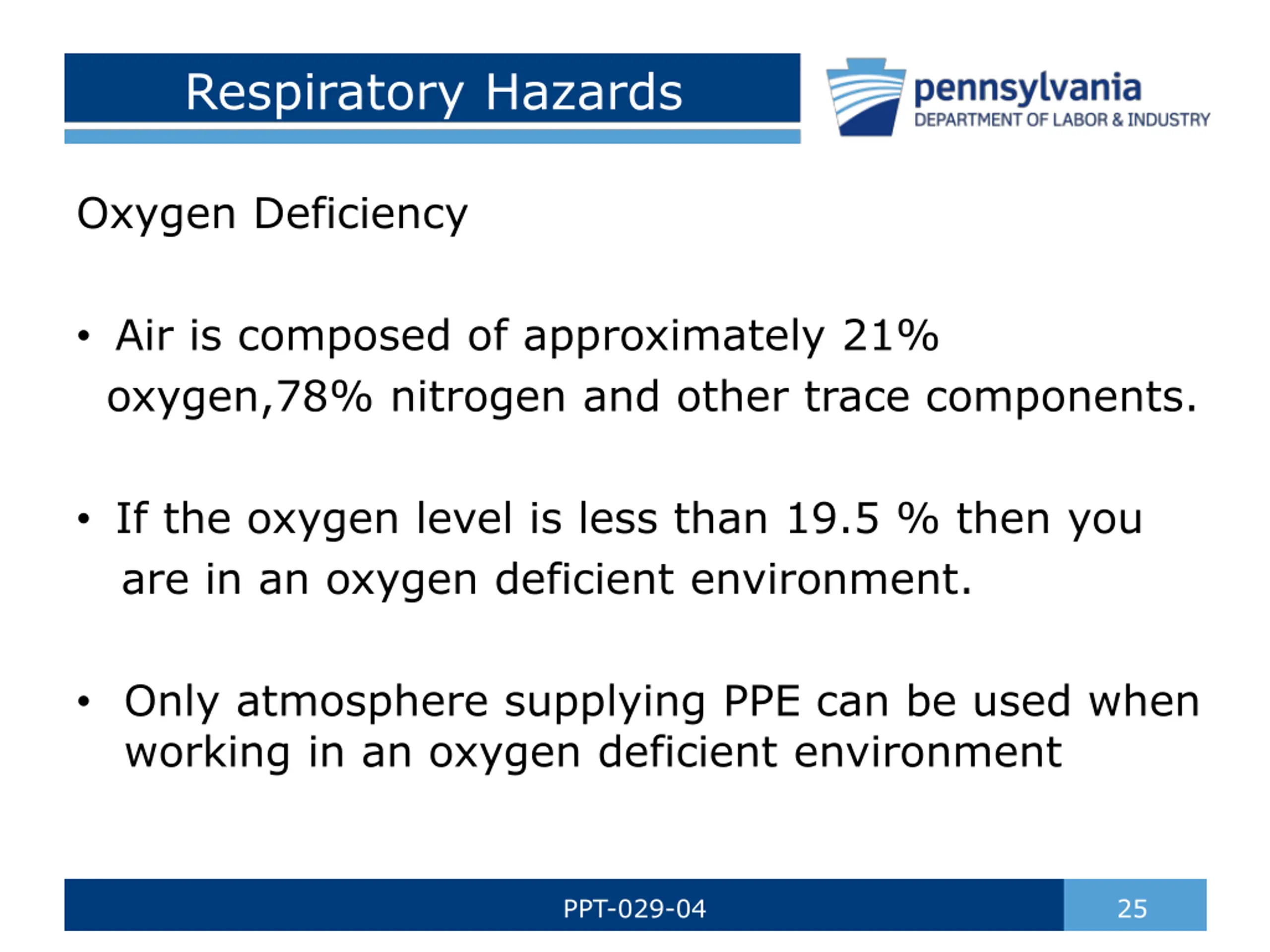 Respiratory Hazards Oxygen Deficiency Air is composed of approximately 21% oxygen,78% nitrogen and other trace components. If the oxygen level is less than 19.5 % then you are in an oxygen deficient environment. Only atmosphere supplying PPE can be used when working in an oxygen deficient environment PPT-029-04 25
