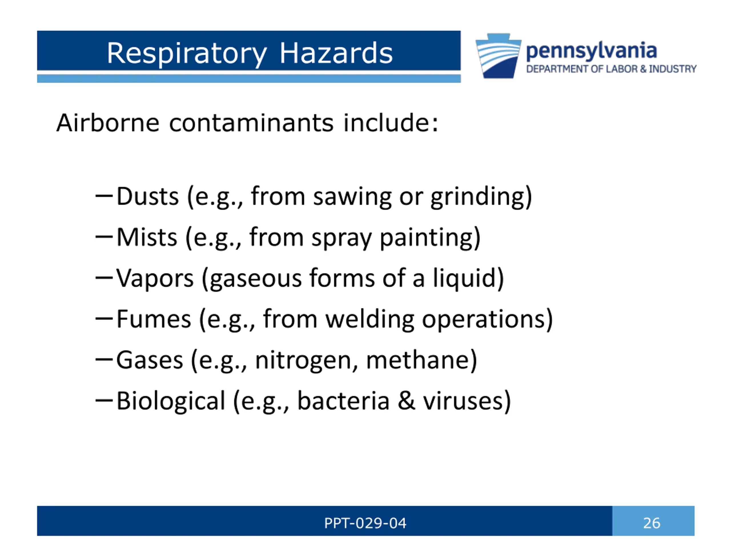 Respiratory Hazards Airborne contaminants include: Dusts (e.g., from sawing or grinding) Mists (e.g., from spray painting) Vapors (gaseous forms of a liquid) Fumes (e.g., from welding operations) Gases (e.g., nitrogen, methane) Biological (e.g., bacteria & viruses) PPT-029-04 26