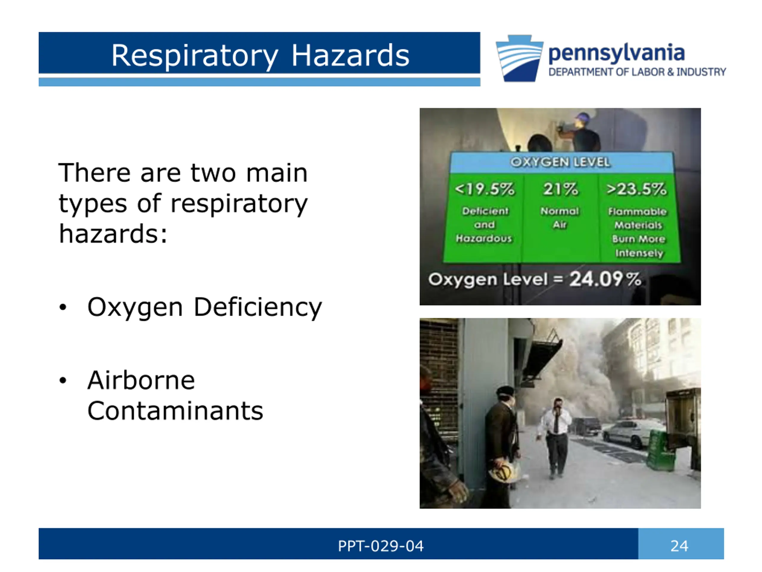 Respiratory Hazards There are two main types of respiratory hazards: Oxygen Deficiency Airborne Contaminants PPT-029-04 24