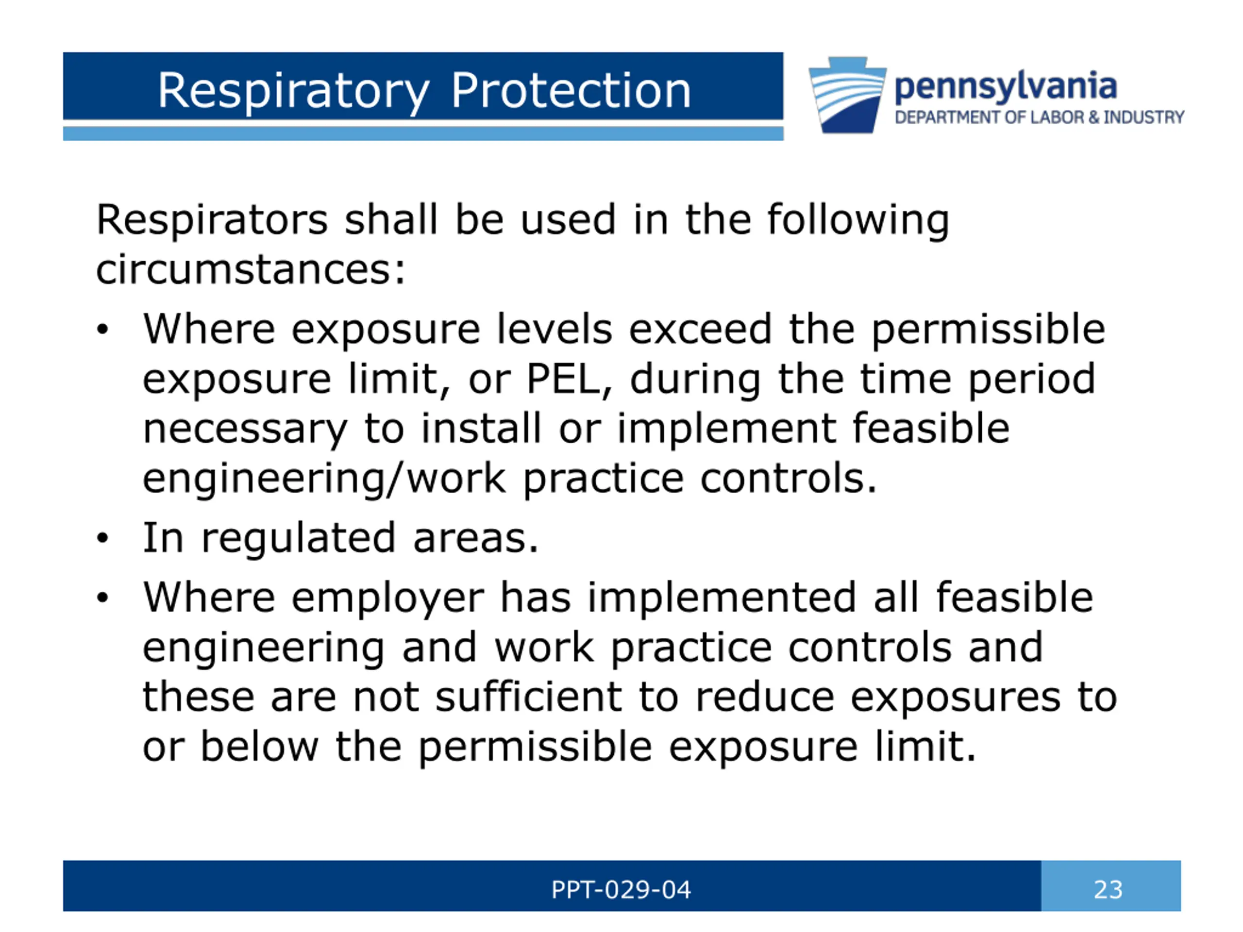 Respiratory Protection Respirators shall be used in the following circumstances: Where exposure levels exceed the permissible exposure limit, or PEL, during the time period necessary to install or implement feasible engineering/work practice controls. In regulated areas. Where employer has implemented all feasible engineering and work practice controls and these are not sufficient to reduce exposures to or below the permissible exposure limit. PPT-029-04 23