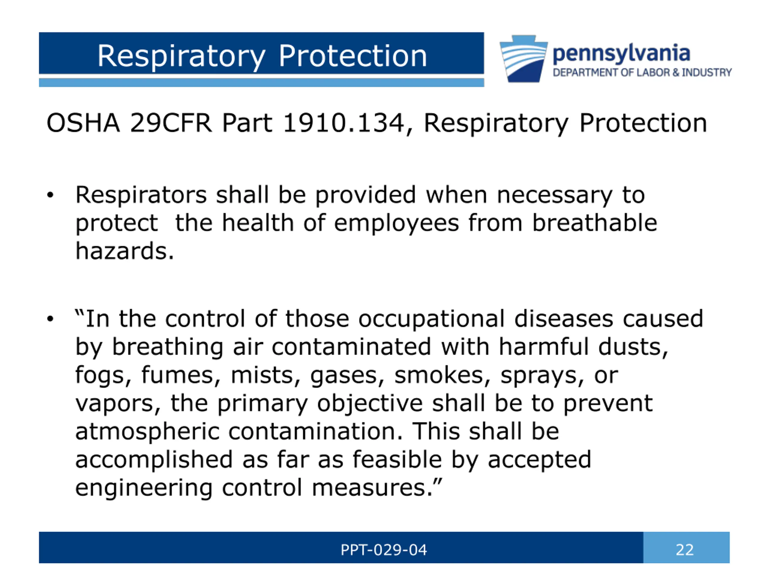 Respiratory Protection OSHA 29CFR Part 1910.134, Respiratory Protection Respirators shall be provided when necessary to protect the health of employees from breathable hazards. In the control of those occupational diseases caused by breathing air contaminated with harmful dusts, fogs, fumes, mists, gases, smokes, sprays, or vapors, the primary objective shall be to prevent atmospheric contamination. This shall be accomplished as far as feasible by accepted engineering control measures. PPT-029-04 22