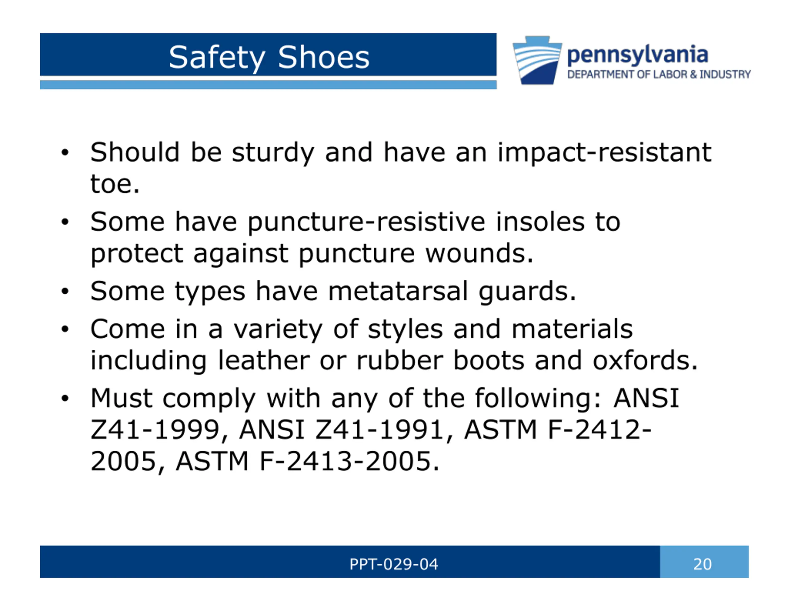 Safety Shoes Should be sturdy and have an impact-resistant toe. Some have puncture-resistive insoles to protect against puncture wounds. Some types have metatarsal guards. Come in a variety of styles and materials including leather or rubber boots and oxfords. Must comply with any of the following: ANSI Z41-1999, ANSI Z41-1991, ASTM F-2412- 2005, ASTM F-2413-2005. PPT-029-04 20