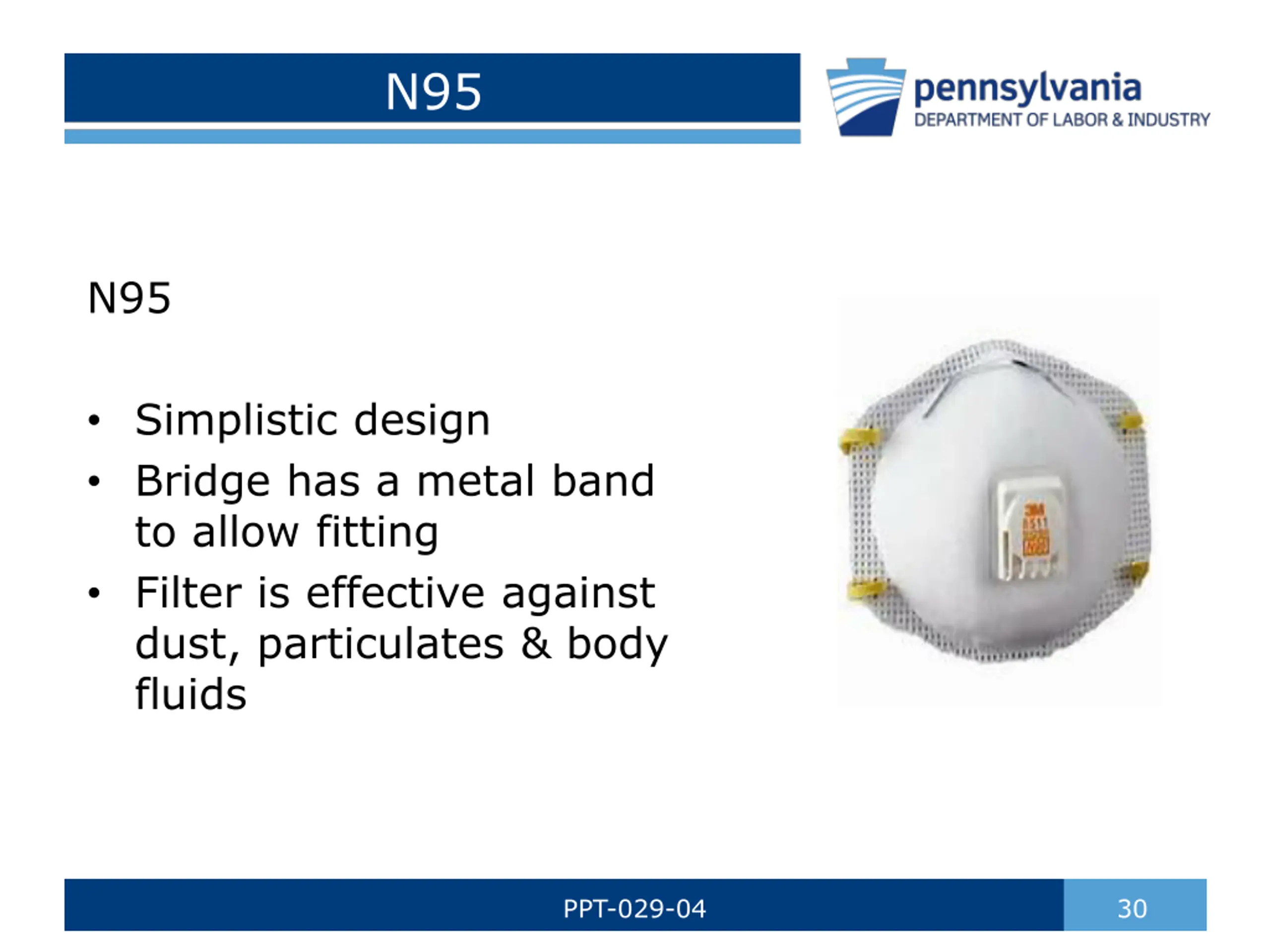 N95 N95 Simplistic design Bridge has a metal band to allow fitting Filter is effective against dust, particulates & body fluids PPT-029-04 30