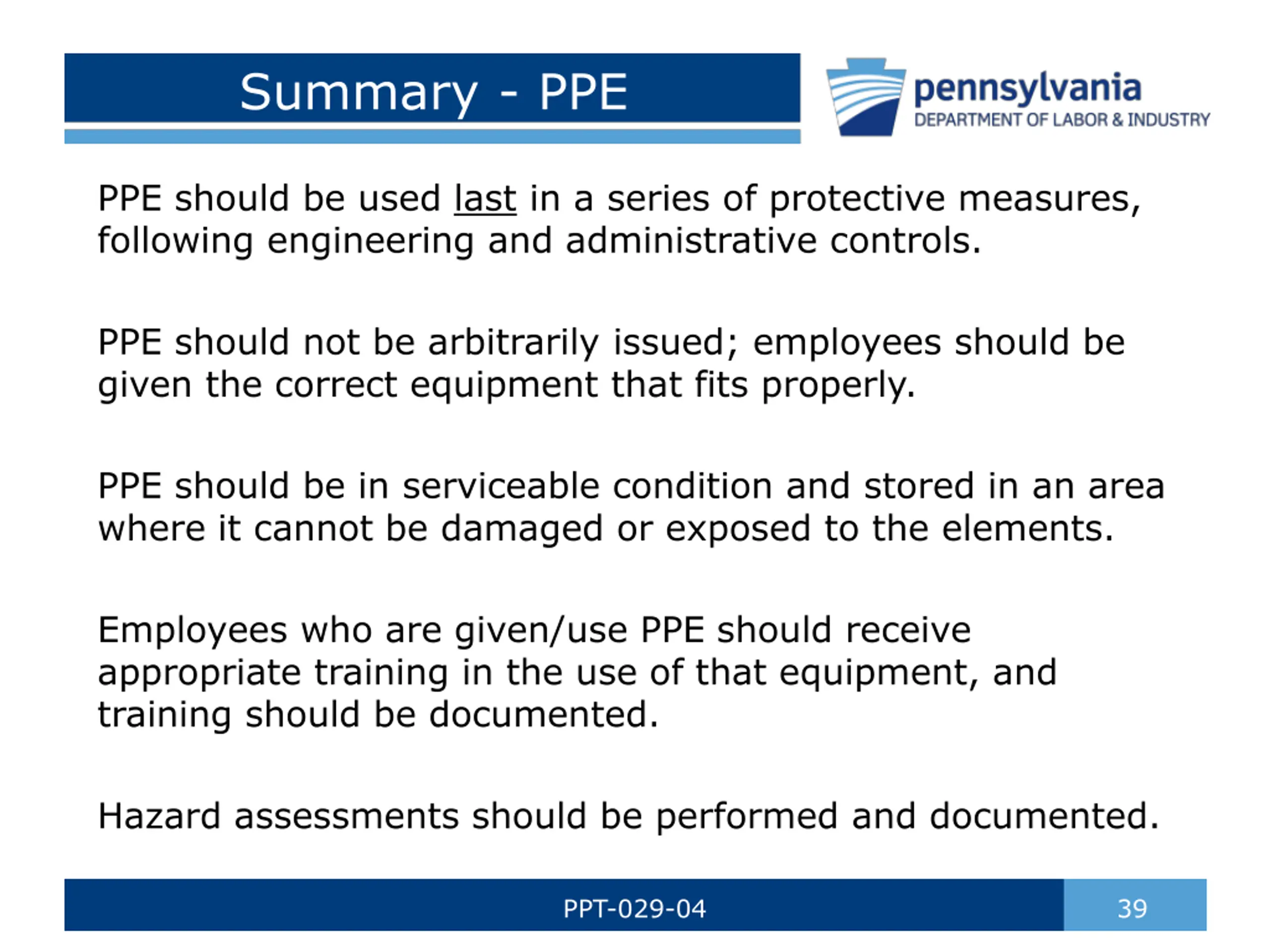 Summary - PPE PPE should be used last in a series of protective measures, following engineering and administrative controls. PPE should not be arbitrarily issued; employees should be given the correct equipment that fits properly. PPE should be in serviceable condition and stored in an area where it cannot be damaged or exposed to the elements. Employees who are given/use PPE should receive appropriate training in the use of that equipment, and training should be documented. Hazard assessments should be performed and documented. PPT-029-04 39