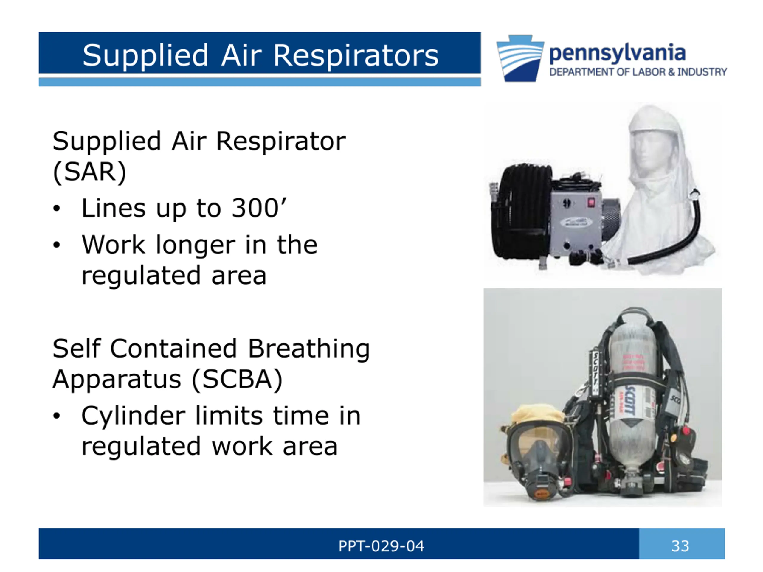 Supplied Air Respirators Supplied Air Respirator (SAR) Lines up to 300 Work longer in the regulated area Self Contained Breathing Apparatus (SCBA) Cylinder limits time in regulated work area PPT-029-04 33