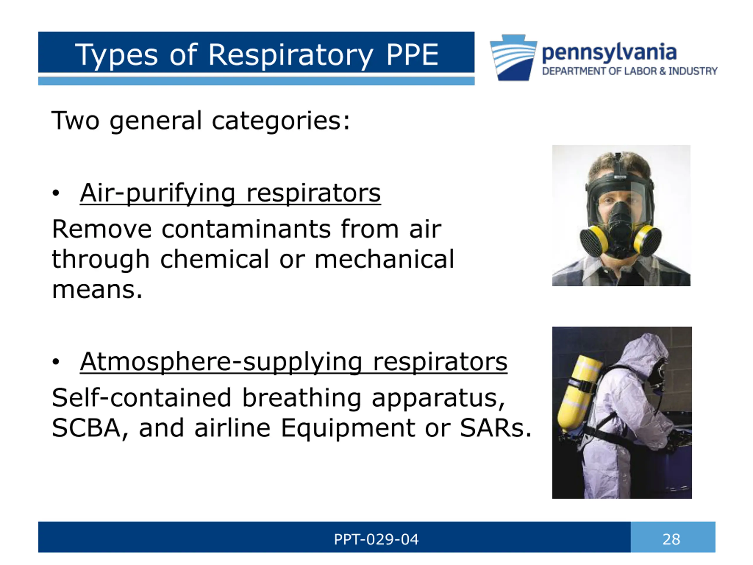 Types of Respiratory PPE Two general categories: Air-purifying respirators Remove contaminants from air through chemical or mechanical means. Atmosphere-supplying respirators Self-contained breathing apparatus, SCBA, and airline Equipment or SARs. or PPT-029-04 28