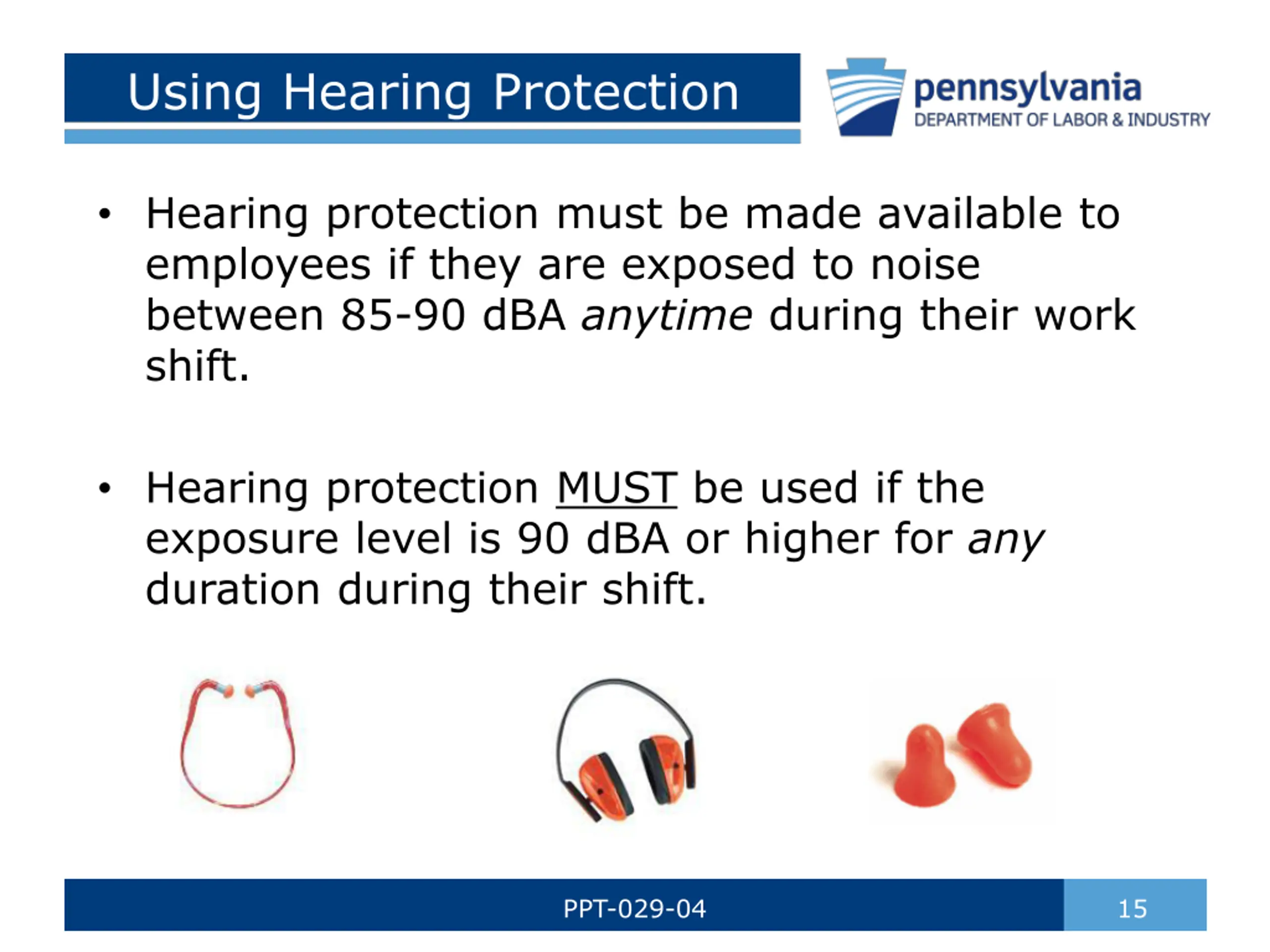 Using Hearing Protection Hearing protection must be made available to employees if they are exposed to noise between 85-90 dBA anytime during their work shift. Hearing protection MUST be used if the exposure level is 90 dBA or higher for any duration during their shift. PPT-029-04 15
