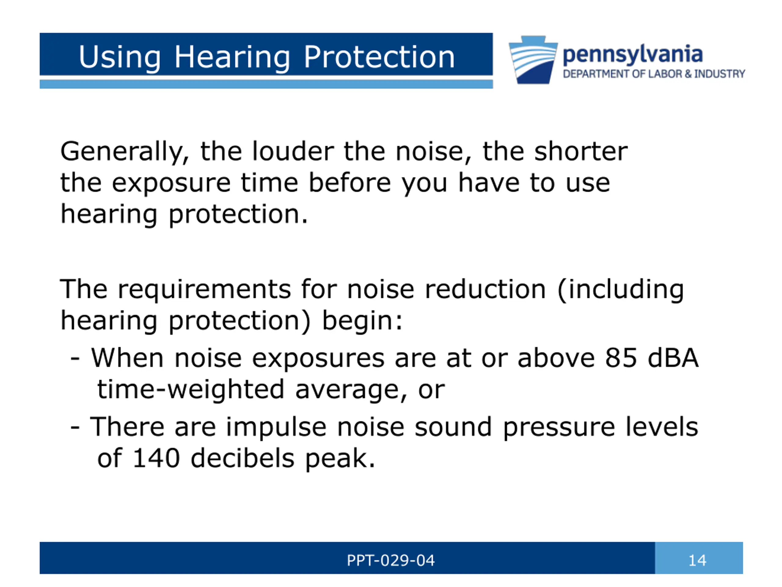 Using Hearing Protection Generally, the louder the noise, the shorter the exposure time before you have to use hearing protection. The requirements for noise reduction (including hearing protection) begin: - When noise exposures are at or above 85 dBA time-weighted average, or - There are impulse noise sound pressure levels of 140 decibels peak. PPT-029-04 14