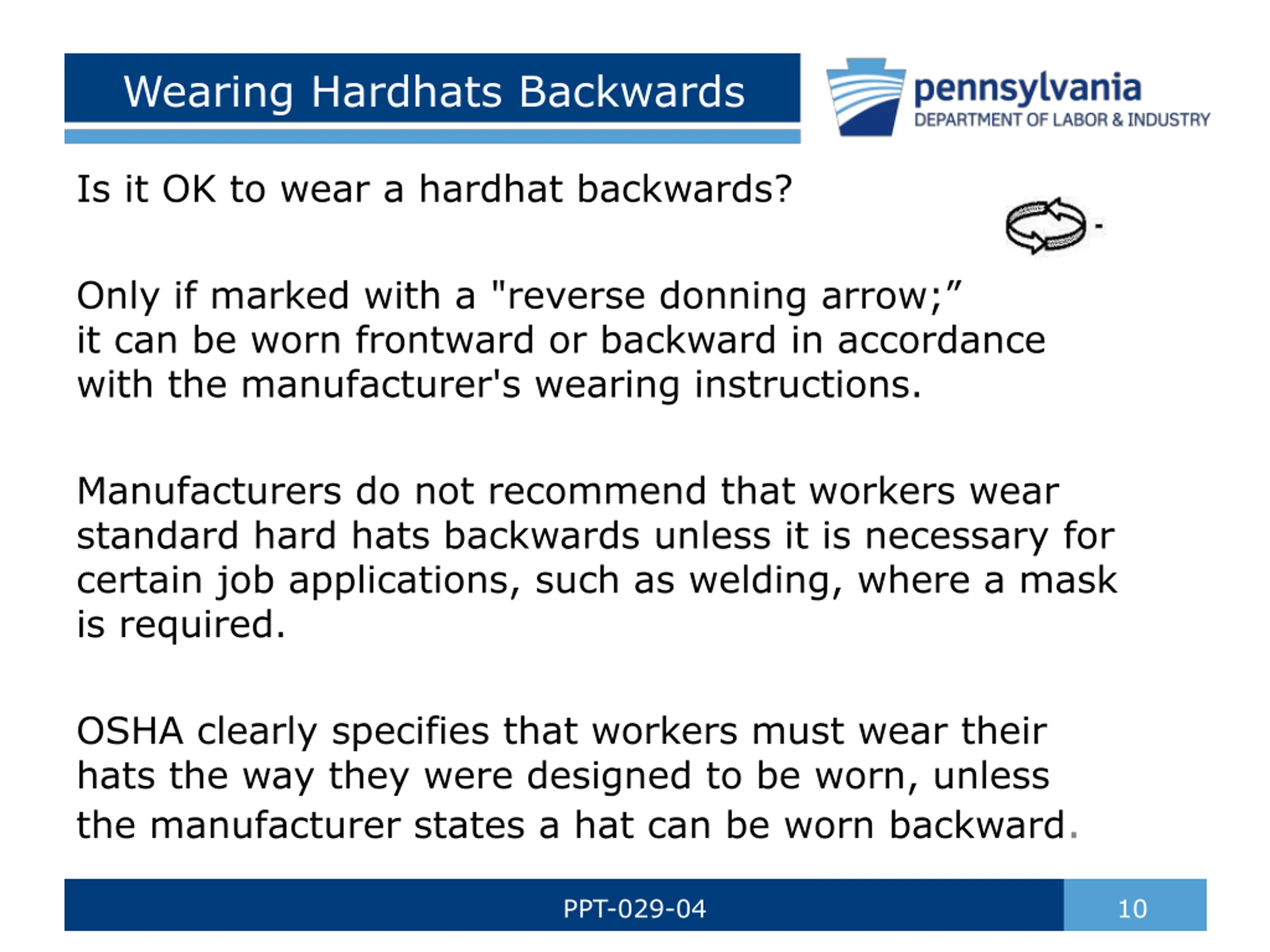 Wearing Hardhats Backwards Is it OK to wear a hardhat backwards? Only if marked with a "reverse donning arrow; it can be worn frontward or backward in accordance with the manufacturer's wearing instructions. Manufacturers do not recommend that workers wear standard hard hats backwards unless it is necessary for certain job applications, such as welding, where a mask is required. OSHA clearly specifies that workers must wear their hats the way they were designed to be worn, unless the manufacturer states a hat can be worn backward. PPT-029-04 10