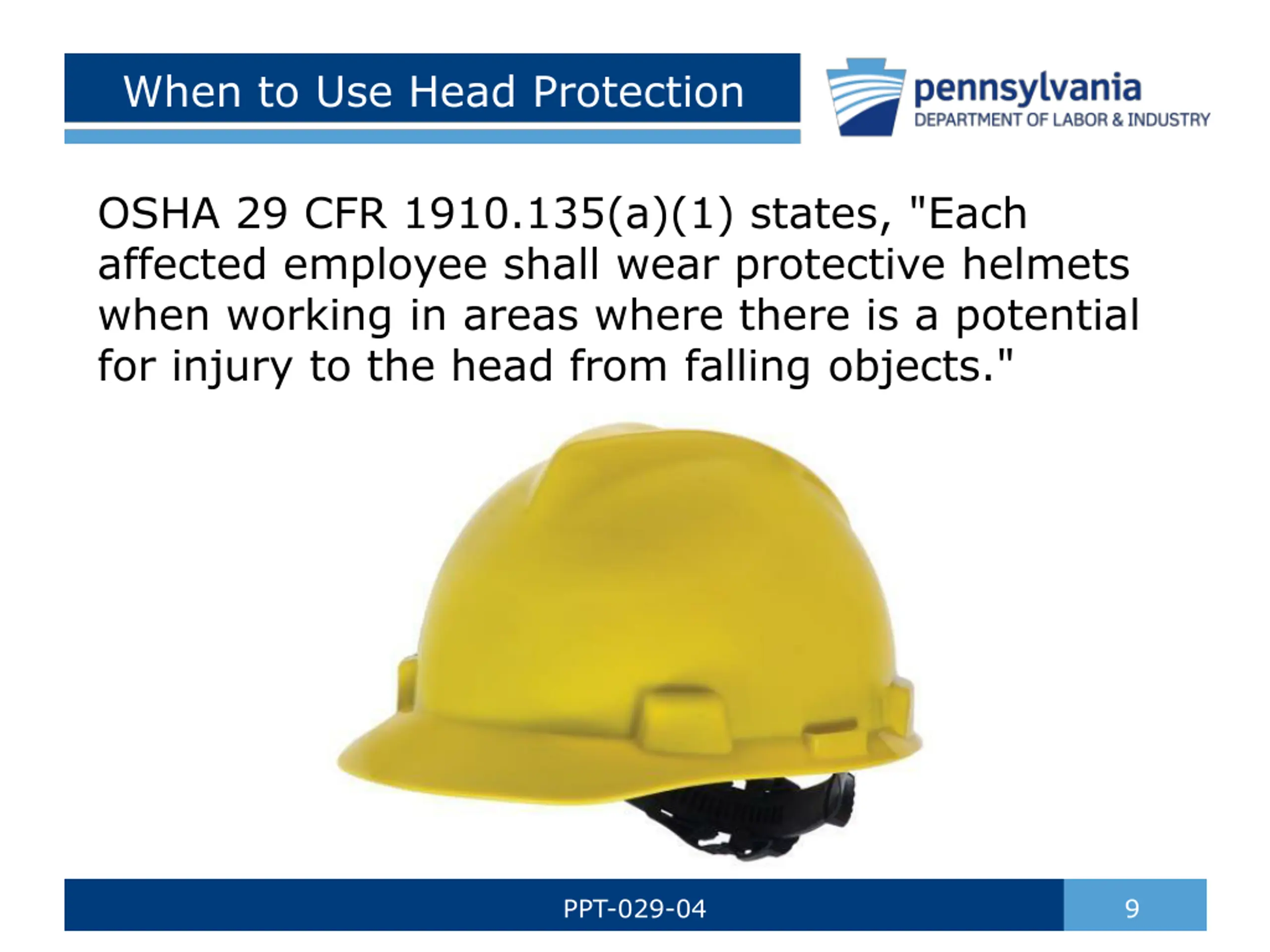When to Use Head Protection OSHA 29 CFR 1910.135(a)(1) states, "Each affected employee shall wear protective helmets when working in areas where there is a potential for injury to the head from falling objects." PPT-029-04 9