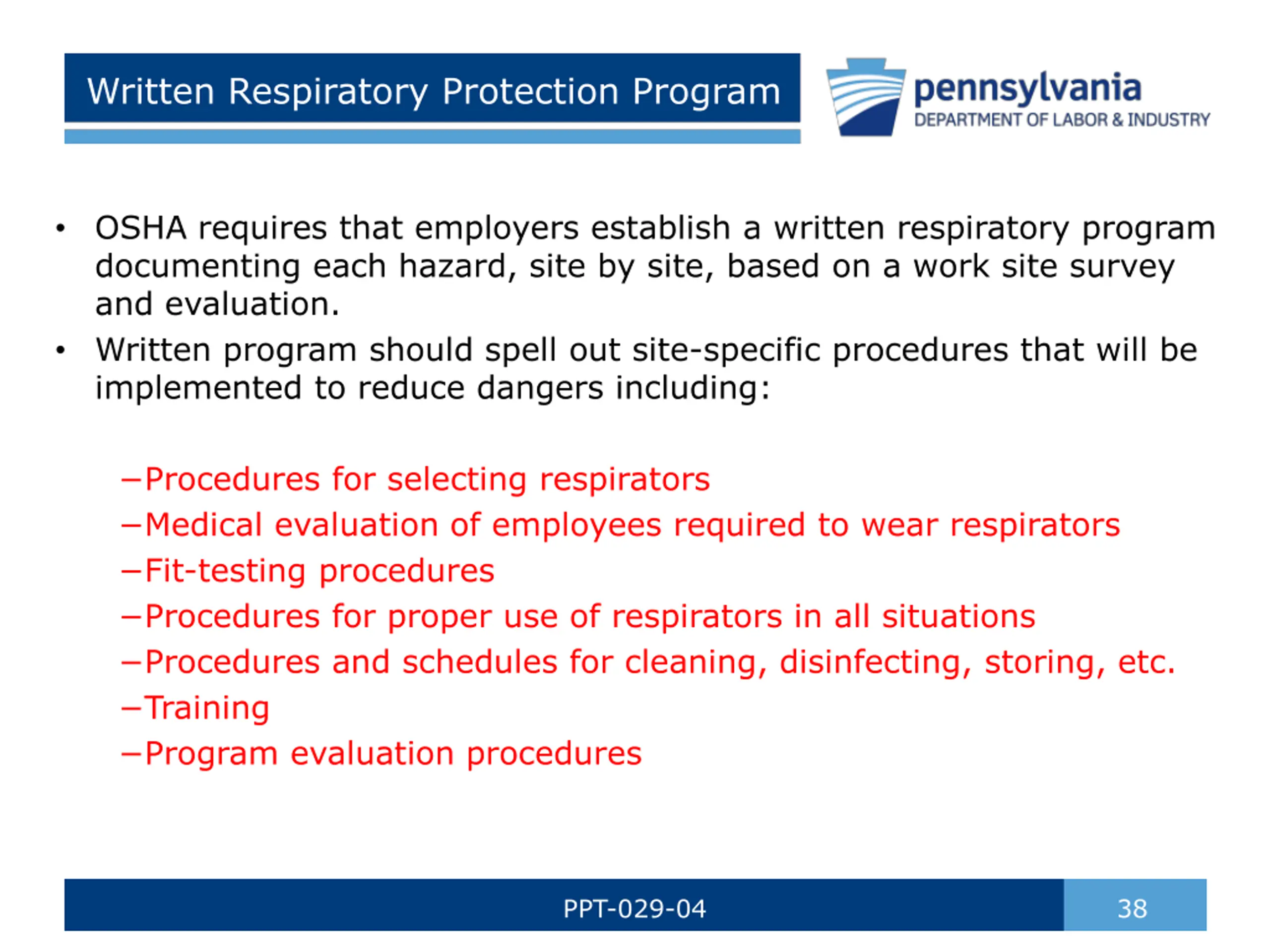 Written Respiratory Protection Program OSHA requires that employers establish a written respiratory program documenting each hazard, site by site, based on a work site survey and evaluation. Written program should spell out site-specific procedures that will be implemented to reduce dangers including: Procedures for selecting respirators Medical evaluation of employees required to wear respirators Fit-testing procedures Procedures for proper use of respirators in all situations Procedures and schedules for cleaning, disinfecting, storing, etc. Training Program evaluation procedures PPT-029-04 38