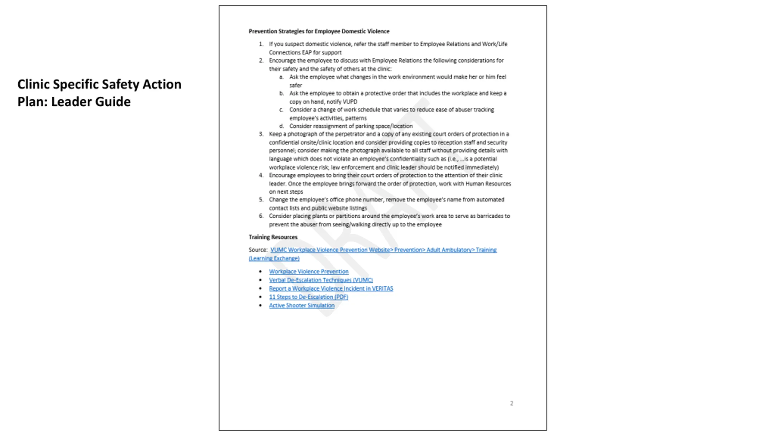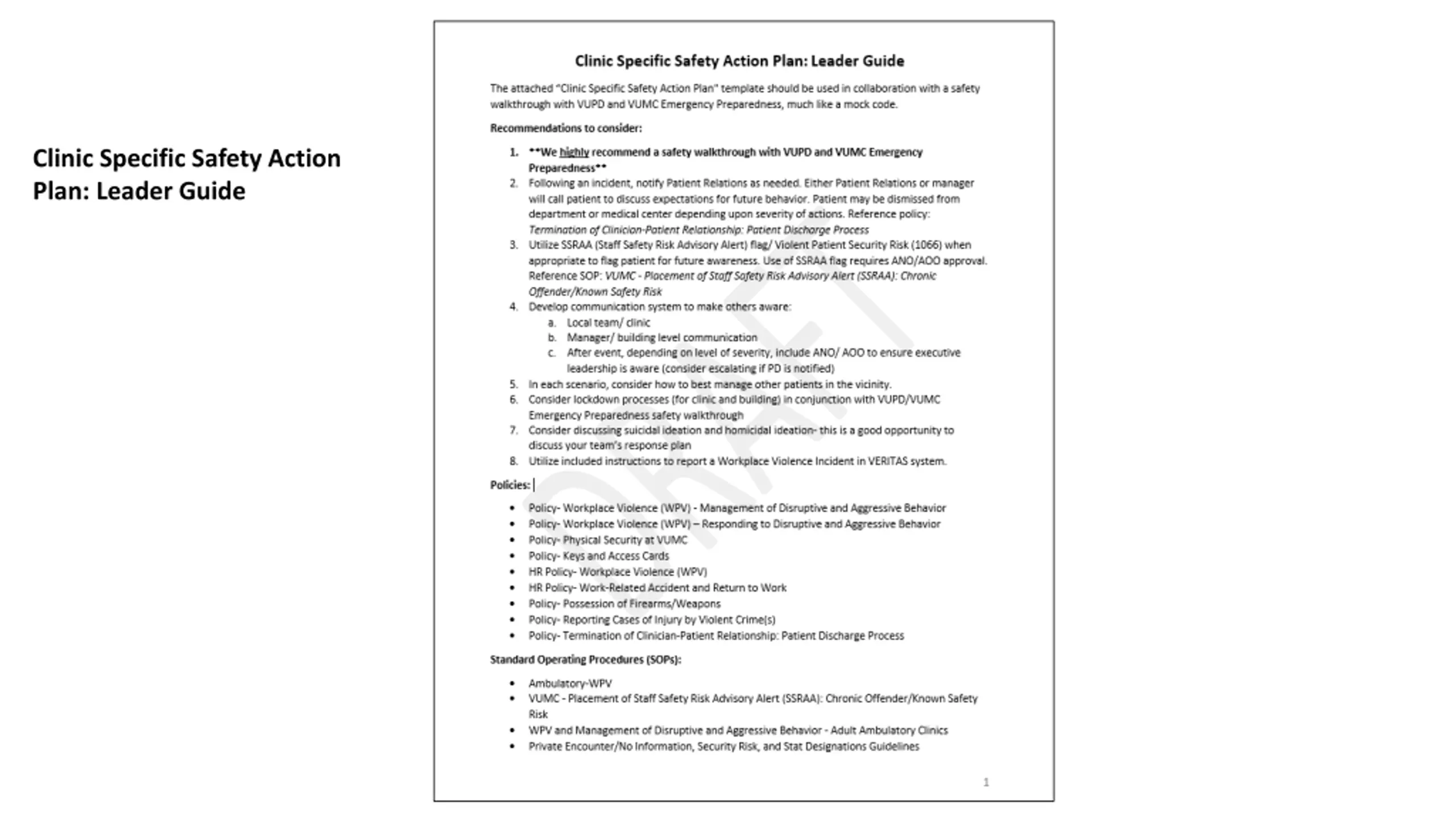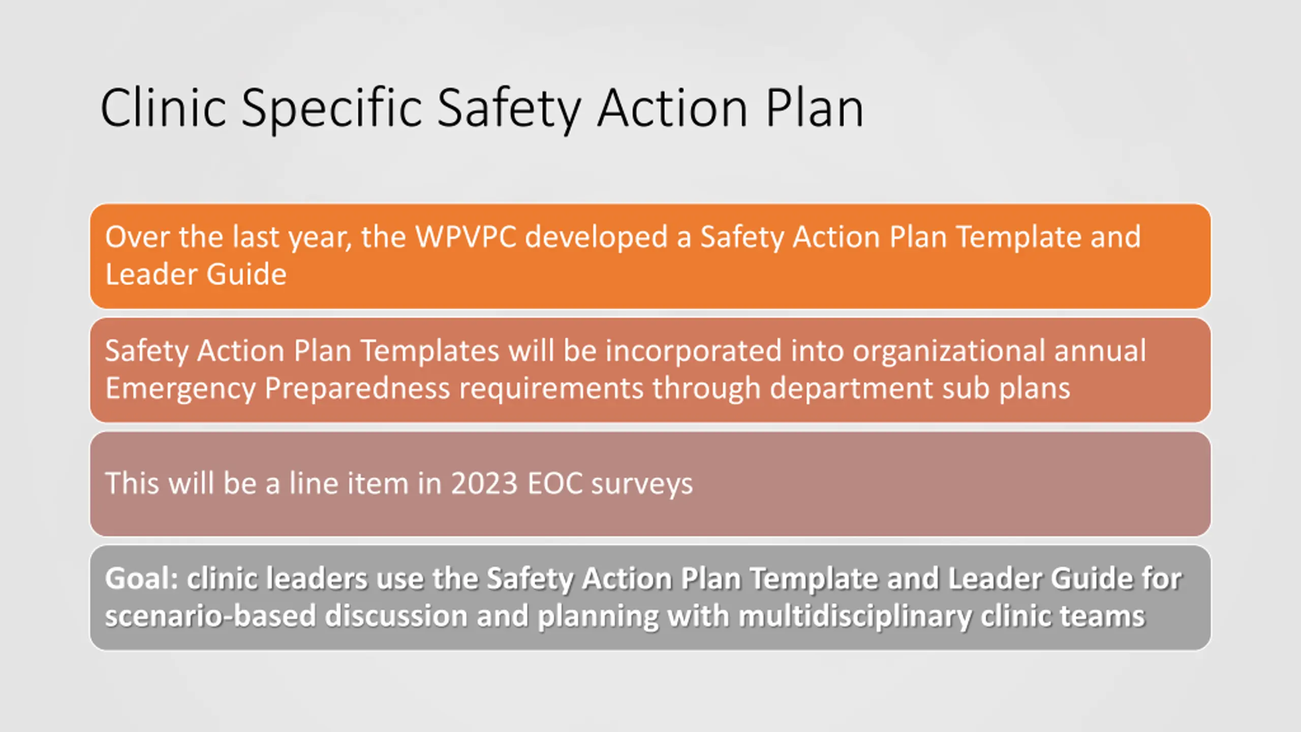 Clinic Specific Safety Action Plan Over the last year, the WPVPC developed a Safety Action Plan Template and Leader Guide Safety Action Plan Templates will be incorporated into organizational annual Emergency Preparedness requirements through department sub plans This will be a line item in 2023 EOC surveys Goal: clinic leaders use the Safety Action Plan Template and Leader Guide for scenario-based discussion and planning with multidisciplinary clinic teams