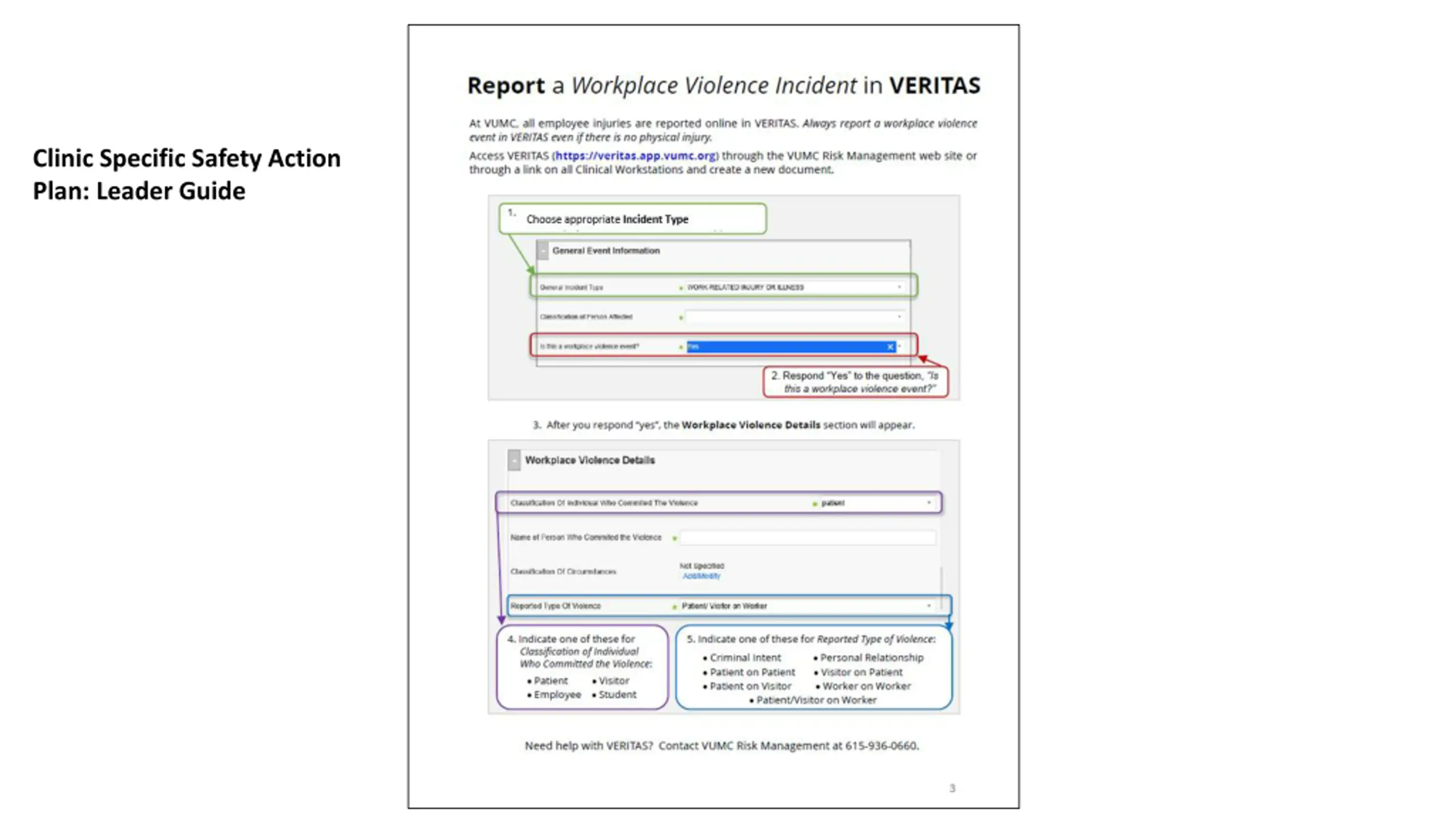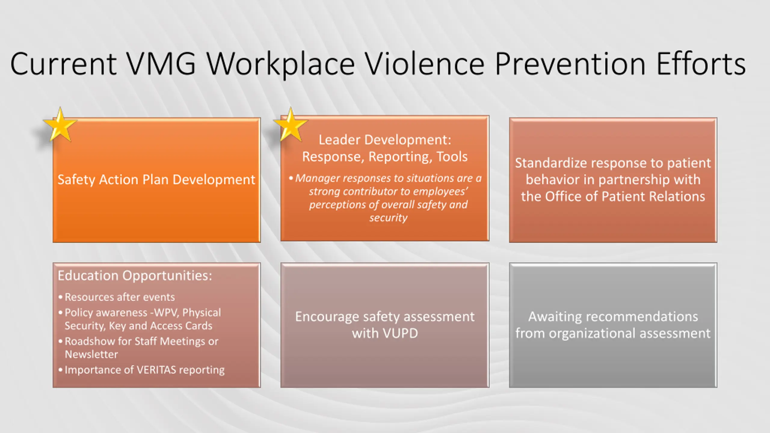 Current VMG Workplace Violence Prevention Efforts Leader Development: Response, Reporting, Tools Standardize response to patient behavior in partnership with the Office of Patient Relations Manager responses to situations are a strong contributor to employees perceptions of overall safety and security Safety Action Plan Development Education Opportunities: Resources after events Policy awareness -WPV, Physical Security, Key and Access Cards Roadshow for Staff Meetings or Newsletter Importance of VERITAS reporting Encourage safety assessment with VUPD Awaiting recommendations from organizational assessment