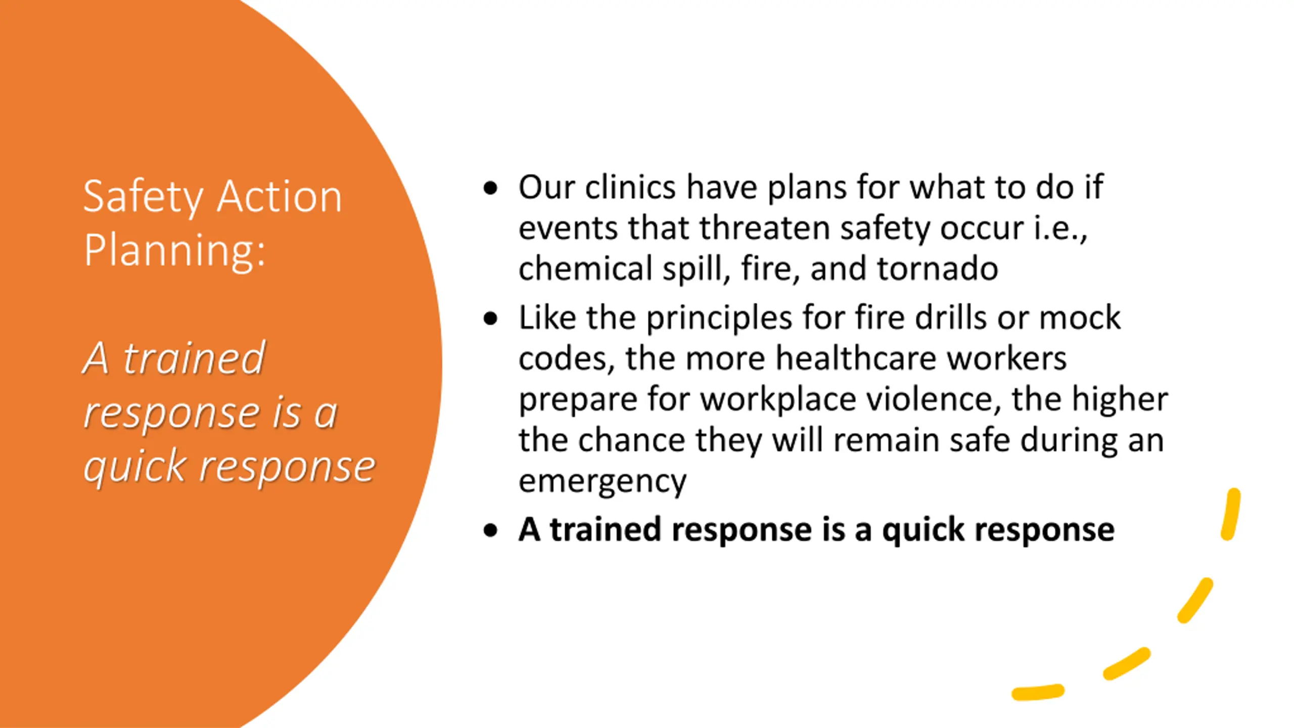 Our clinics have plans for what to do if events that threaten safety occur i.e., chemical spill, fire, and tornado Like the principles for fire drills or mock codes, the more healthcare workers prepare for workplace violence, the higher the chance they will remain safe during an emergency A trained response is a quick response Safety Action Planning: A trained response is a quick response