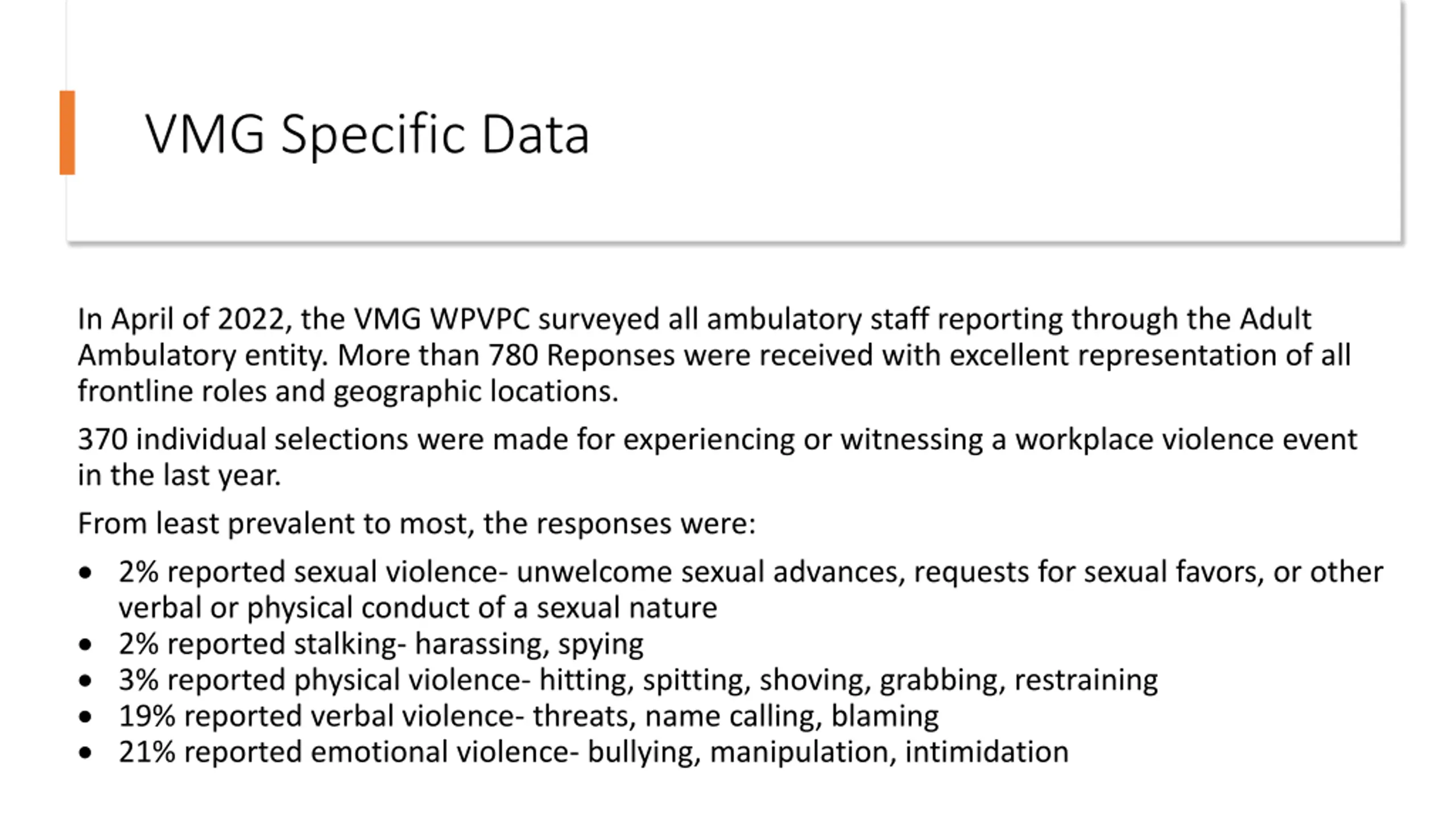 VMG Specific Data In April of 2022, the VMG WPVPC surveyed all ambulatory staff reporting through the Adult Ambulatory entity. More than 780 Reponses were received with excellent representation of all frontline roles and geographic locations. 370 individual selections were made for experiencing or witnessing a workplace violence event in the last year. From least prevalent to most, the responses were: 2% reported sexual violence- unwelcome sexual advances, requests for sexual favors, or other verbal or physical conduct of a sexual nature 2% reported stalking- harassing, spying 3% reported physical violence- hitting, spitting, shoving, grabbing, restraining 19% reported verbal violence- threats, name calling, blaming 21% reported emotional violence- bullying, manipulation, intimidation