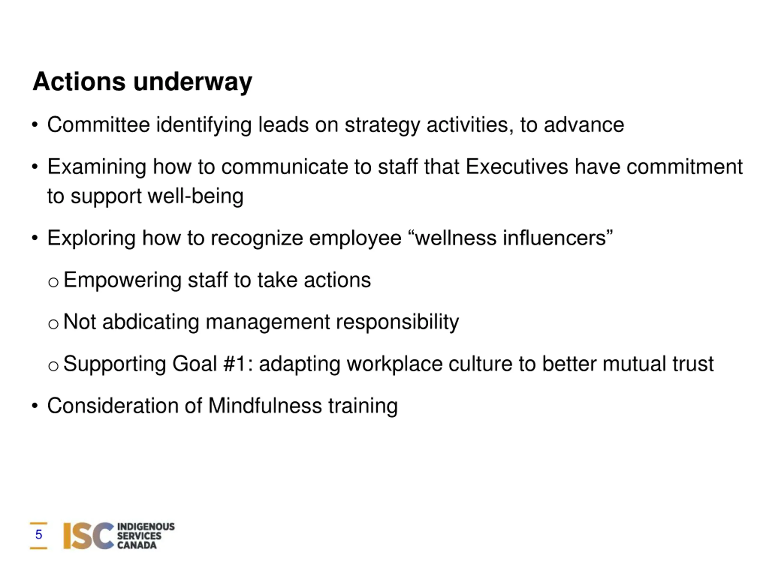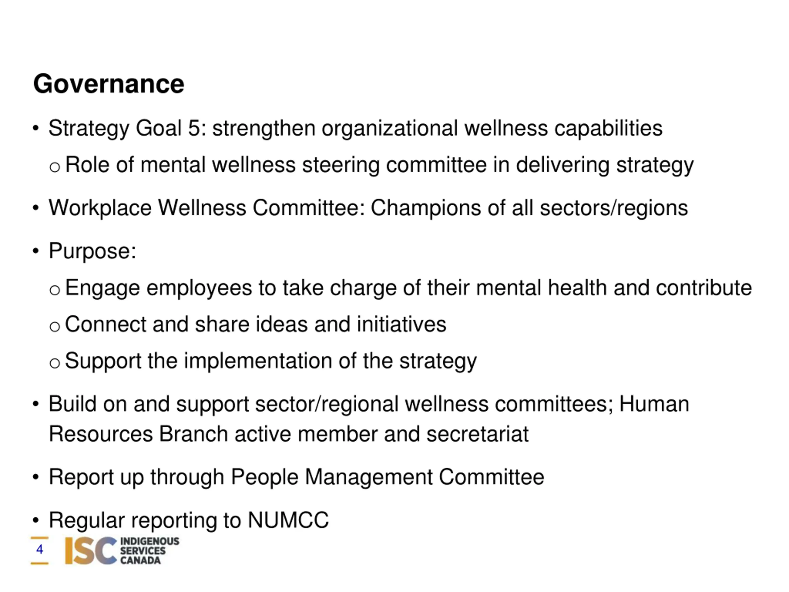 Governance Strategy Goal 5: strengthen organizational wellness capabilities oRole of mental wellness steering committee in delivering strategy Workplace Wellness Committee: Champions of all sectors/regions Purpose: oEngage employees to take charge of their mental health and contribute oConnect and share ideas and initiatives oSupport the implementation of the strategy Build on and support sector/regional wellness committees; Human Resources Branch active member and secretariat Report up through People Management Committee Regular reporting to NUMCC 4