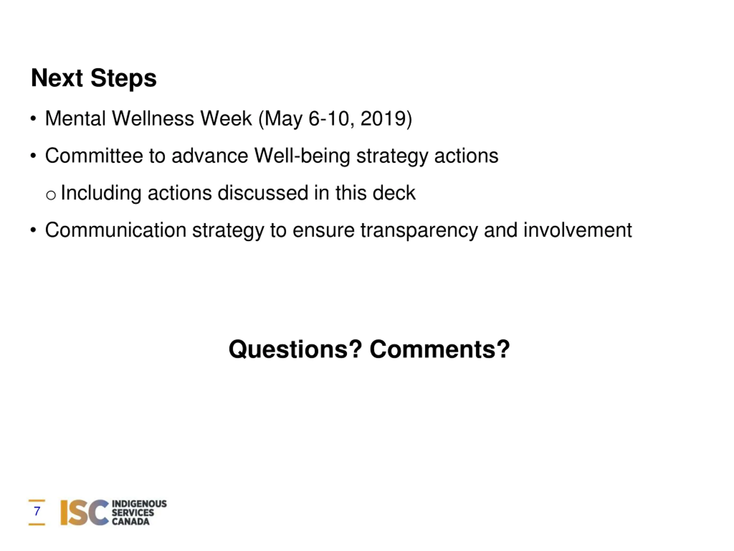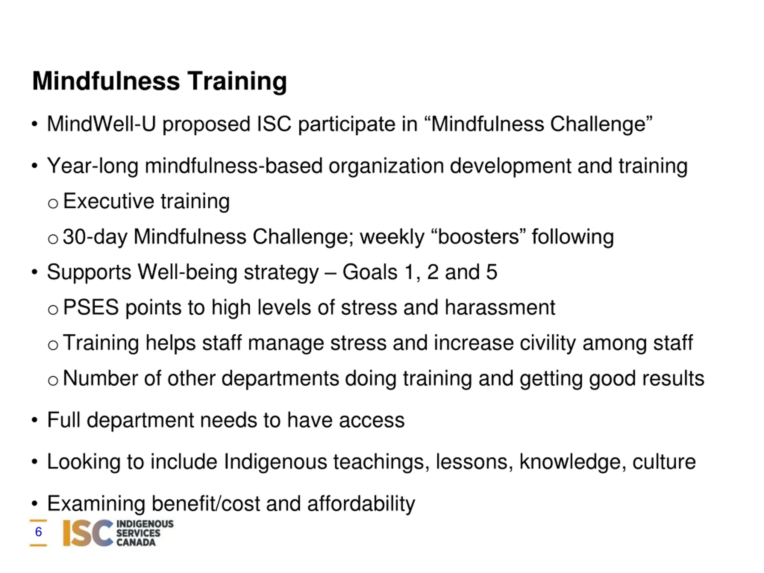 Mindfulness Training MindWell-U proposed ISC participate in Mindfulness Challenge Year-long mindfulness-based organization development and training oExecutive training o30-day Mindfulness Challenge; weekly boosters following Supports Well-being strategy Goals 1, 2 and 5 oPSES points to high levels of stress and harassment oTraining helps staff manage stress and increase civility among staff oNumber of other departments doing training and getting good results Full department needs to have access Looking to include Indigenous teachings, lessons, knowledge, culture Examining benefit/cost and affordability 6