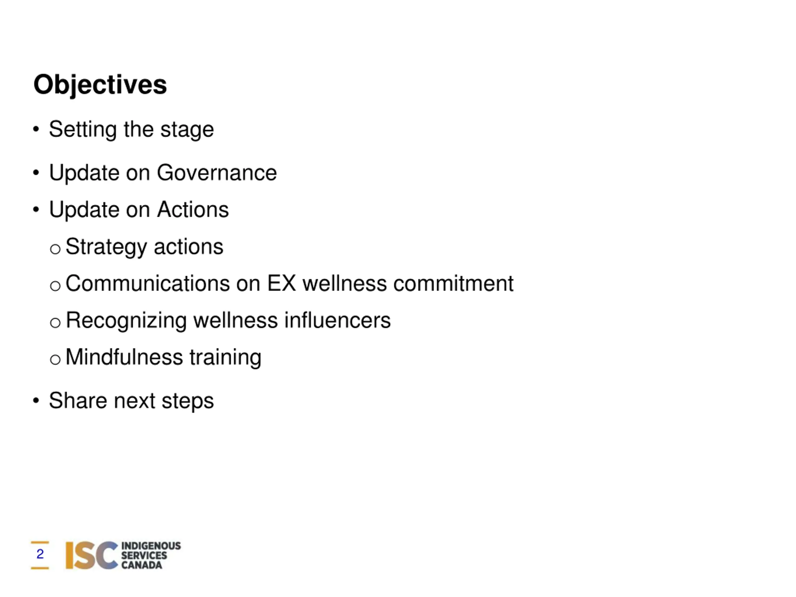 This update covers the governance, actions, and mindfulness training related to workplace well-being and mental health initiatives. Strategies include strengthening organizational wellness capabilities, engaging employees, and supporting well-being influencers. Mindfulness training is proposed to address stress and promote civility among staff.