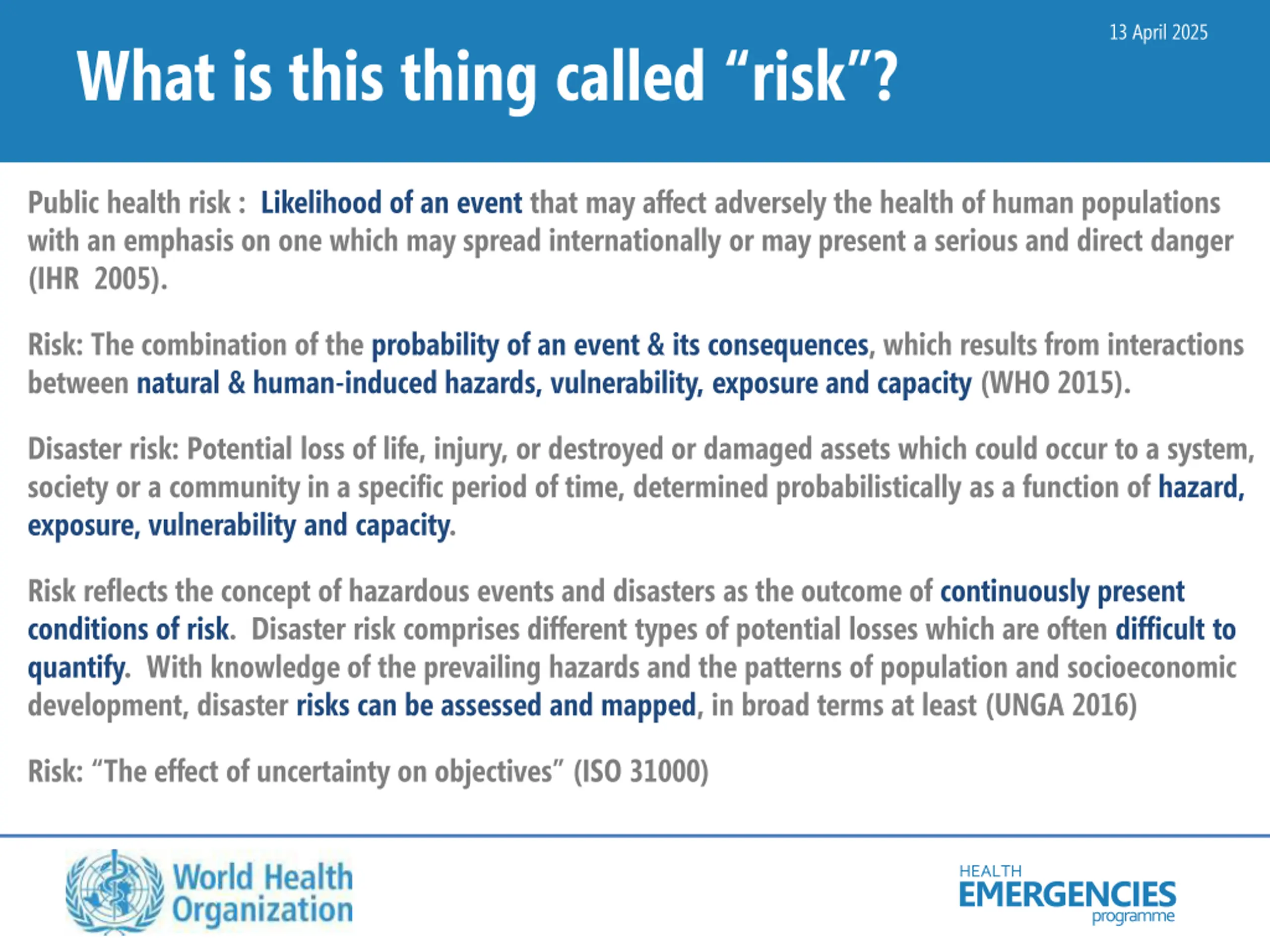 13 April 2025 What is this thing called risk ? Public health risk : Likelihood of an event that may affect adversely the health of human populations with an emphasis on one which may spread internationally or may present a serious and direct danger (IHR 2005). Risk: The combination of the probability of an event & its consequences, which results from interactions between natural & human-induced hazards, vulnerability, exposure and capacity (WHO 2015). Disaster risk: Potential loss of life, injury, or destroyed or damaged assets which could occur to a system, society or a community in a specific period of time, determined probabilistically as a function of hazard, exposure, vulnerability and capacity. Risk reflects the concept of hazardous events and disasters as the outcome of continuously present conditions of risk. Disaster risk comprises different types of potential losses which are often difficult to quantify. With knowledge of the prevailing hazards and the patterns of population and socioeconomic development, disaster risks can be assessed and mapped, in broad terms at least (UNGA 2016) Risk: The effect of uncertainty on objectives (ISO 31000) HEALTH EMERGENCIES programme