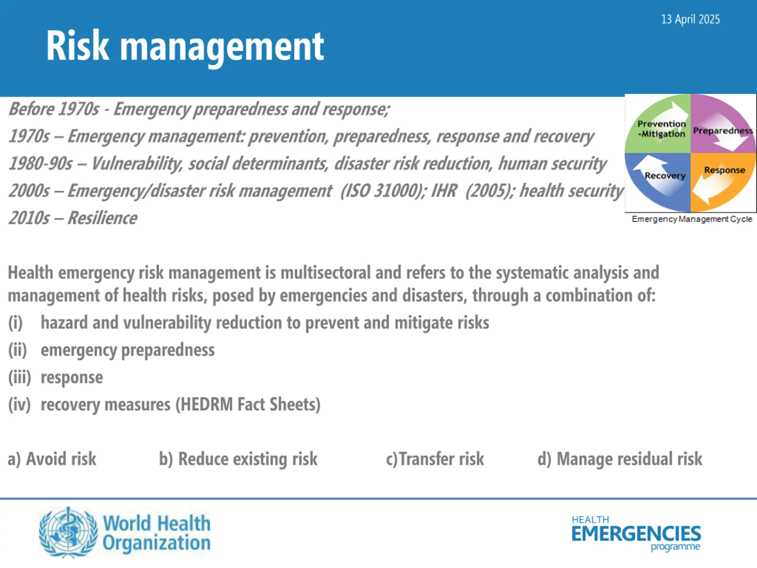13 April 2025 Risk management Before 1970s - Emergency preparedness and response; 1970s Emergency management: prevention, preparedness, response and recovery 1980-90s Vulnerability, social determinants, disaster risk reduction, human security 2000s Emergency/disaster risk management (ISO 31000); IHR (2005); health security 2010s Resilience Health emergency risk management is multisectoral and refers to the systematic analysis and management of health risks, posed by emergencies and disasters, through a combination of: (i) hazard and vulnerability reduction to prevent and mitigate risks (ii) emergency preparedness (iii) response (iv) recovery measures (HEDRM Fact Sheets) a) Avoid risk b) Reduce existing risk c)Transfer risk d) Manage residual risk HEALTH EMERGENCIES programme