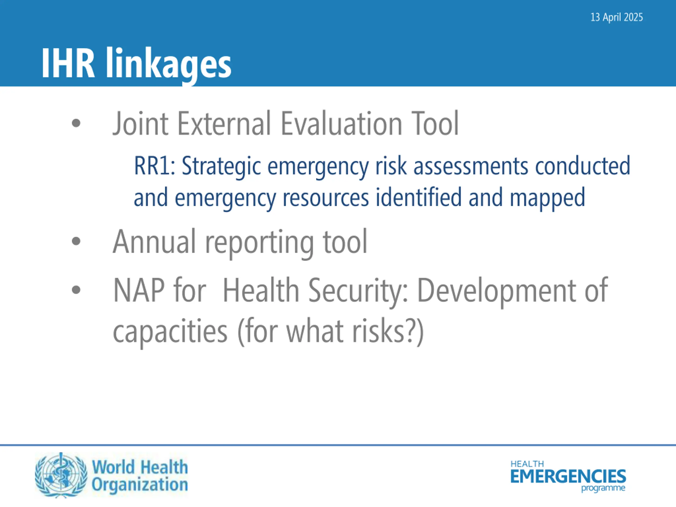 13 April 2025 IHR linkages Joint External Evaluation Tool RR1: Strategic emergency risk assessments conducted and emergency resources identified and mapped Annual reporting tool NAP for Health Security: Development of capacities (for what risks?) HEALTH EMERGENCIES programme