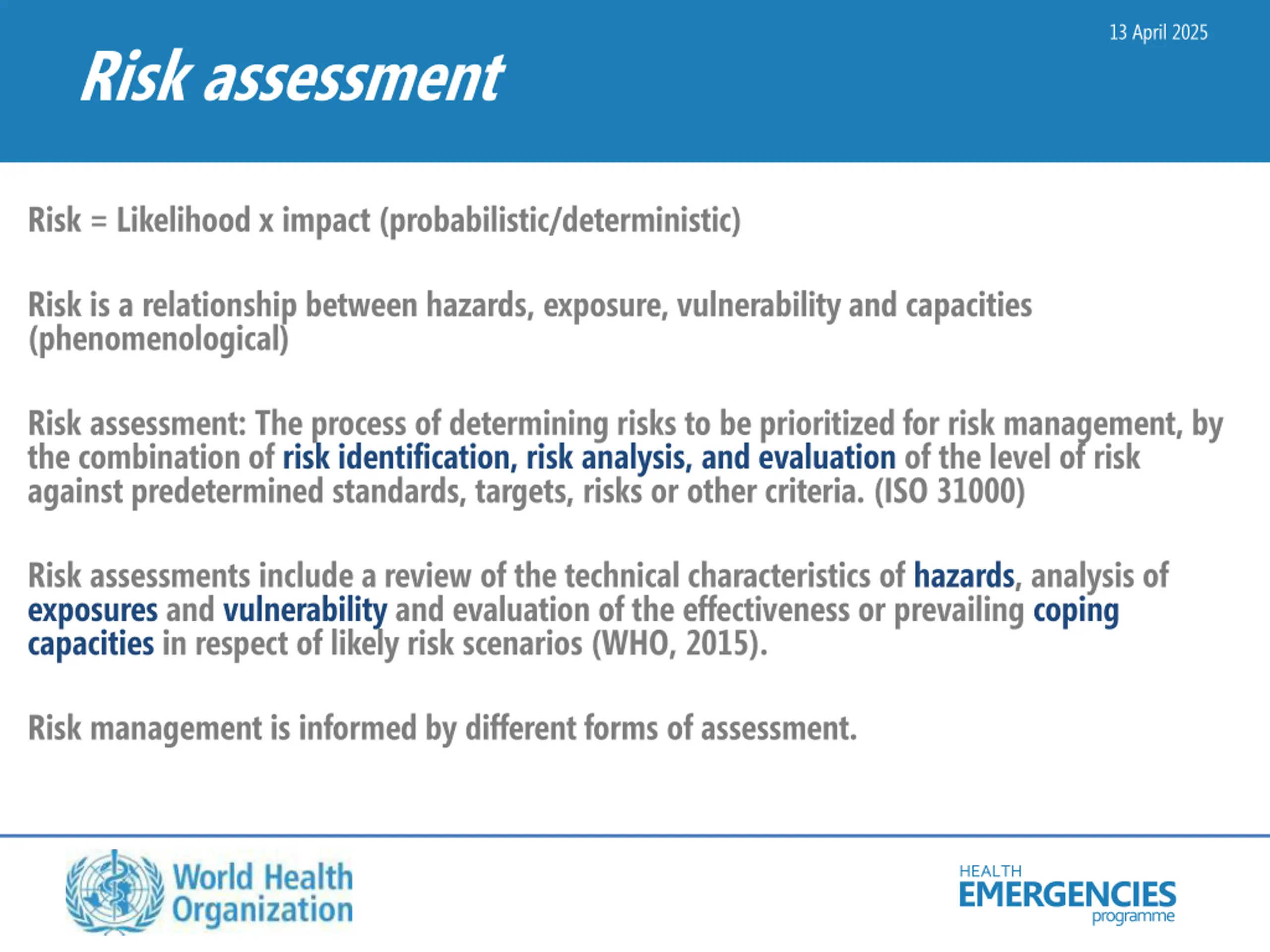 13 April 2025 Risk assessment Risk = Likelihood x impact (probabilistic/deterministic) Risk is a relationship between hazards, exposure, vulnerability and capacities (phenomenological) Risk assessment: The process of determining risks to be prioritized for risk management, by the combination of risk identification, risk analysis, and evaluation of the level of risk against predetermined standards, targets, risks or other criteria. (ISO 31000) Risk assessments include a review of the technical characteristics of hazards, analysis of exposures and vulnerability and evaluation of the effectiveness or prevailing coping capacities in respect of likely risk scenarios (WHO, 2015). Risk management is informed by different forms of assessment. HEALTH EMERGENCIES programme