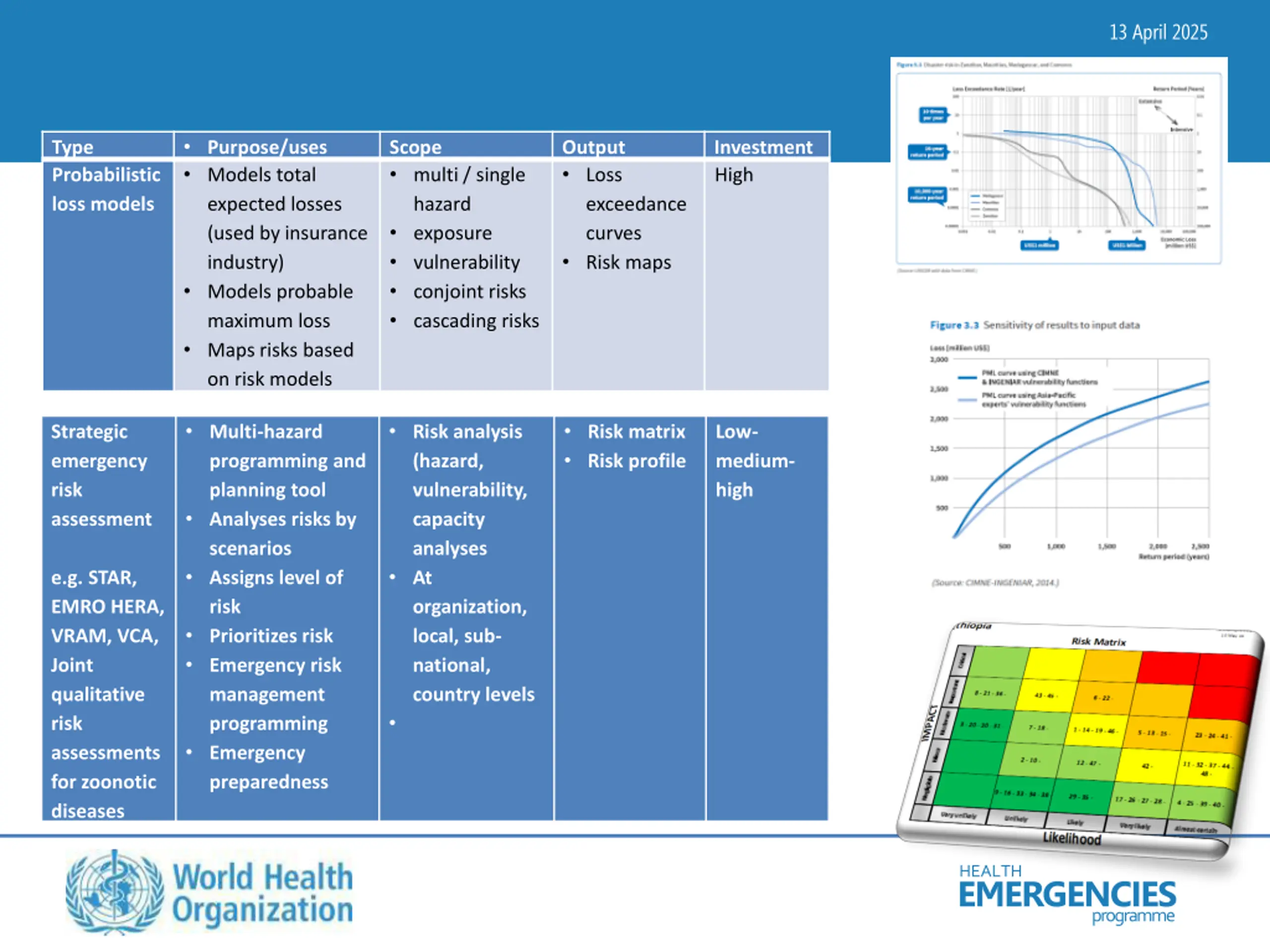13 April 2025 Purpose/uses Models total expected losses (used by insurance industry) Models probable maximum loss Maps risks based on risk models Type Probabilistic loss models Scope multi / single hazard exposure vulnerability conjoint risks cascading risks Output Loss exceedance curves Risk maps Investment High Multi-hazard programming and planning tool Analyses risks by scenarios Assigns level of risk Prioritizes risk Emergency risk management programming Emergency preparedness Risk analysis (hazard, vulnerability, capacity analyses At organization, local, sub- national, country levels Risk matrix Risk profile Strategic emergency risk assessment Low- medium- high e.g. STAR, EMRO HERA, VRAM, VCA, Joint qualitative risk assessments for zoonotic diseases HEALTH EMERGENCIES programme