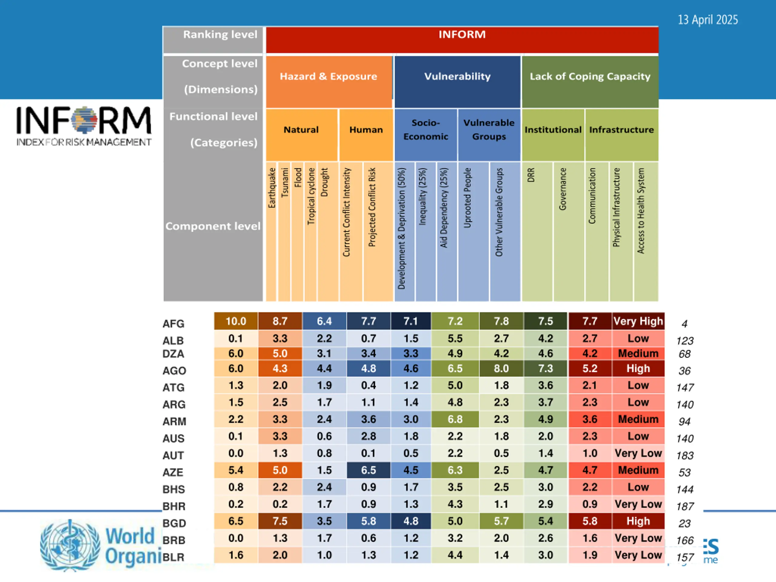 13 April 2025 Ranking level INFORM Concept level Hazard & Exposure Vulnerability Lack of Coping Capacity (Dimensions) Functional level Socio- Economic Vulnerable Groups Natural Human Institutional Infrastructure (Categories) Projected Conflict Risk Earthquake Tsunami Flood Tropical cyclone Drought Current Conflict Intensity Development & Deprivation (50%) Inequality (25%) Aid Dependency (25%) Uprooted People Other Vulnerable Groups DRR Governance Communication Physical Infrastructure Access to Health System Component level AFG ALB DZA AGO ATG ARG ARM AUS AUT AZE BHS BHR BGD BRB BLR 10.0 0.1 6.0 6.0 1.3 1.5 2.2 0.1 0.0 5.4 0.8 0.2 6.5 0.0 1.6 8.7 3.3 5.0 4.3 2.0 2.5 3.3 3.3 1.3 5.0 2.2 0.2 7.5 1.3 2.0 6.4 2.2 3.1 4.4 1.9 1.7 2.4 0.6 0.8 1.5 2.4 1.7 3.5 1.7 1.0 7.7 0.7 3.4 4.8 0.4 1.1 3.6 2.8 0.1 6.5 0.9 0.9 5.8 0.6 1.3 7.1 1.5 3.3 4.6 1.2 1.4 3.0 1.8 0.5 4.5 1.7 1.3 4.8 1.2 1.2 7.2 5.5 4.9 6.5 5.0 4.8 6.8 2.2 2.2 6.3 3.5 4.3 5.0 3.2 4.4 7.8 2.7 4.2 8.0 1.8 2.3 2.3 1.8 0.5 2.5 2.5 1.1 5.7 2.0 1.4 7.5 4.2 4.6 7.3 3.6 3.7 4.9 2.0 1.4 4.7 3.0 2.9 5.4 2.6 3.0 7.7 2.7 4.2 5.2 2.1 2.3 3.6 2.3 1.0 4.7 2.2 0.9 5.8 1.6 Very High Low Medium High Low Low Medium Low Very Low Medium Low Very Low High Very Low 4 123 68 36 147 140 94 140 183 53 144 187 23 166 HEALTH EMERGENCIES 1.9 Very Low programme 157