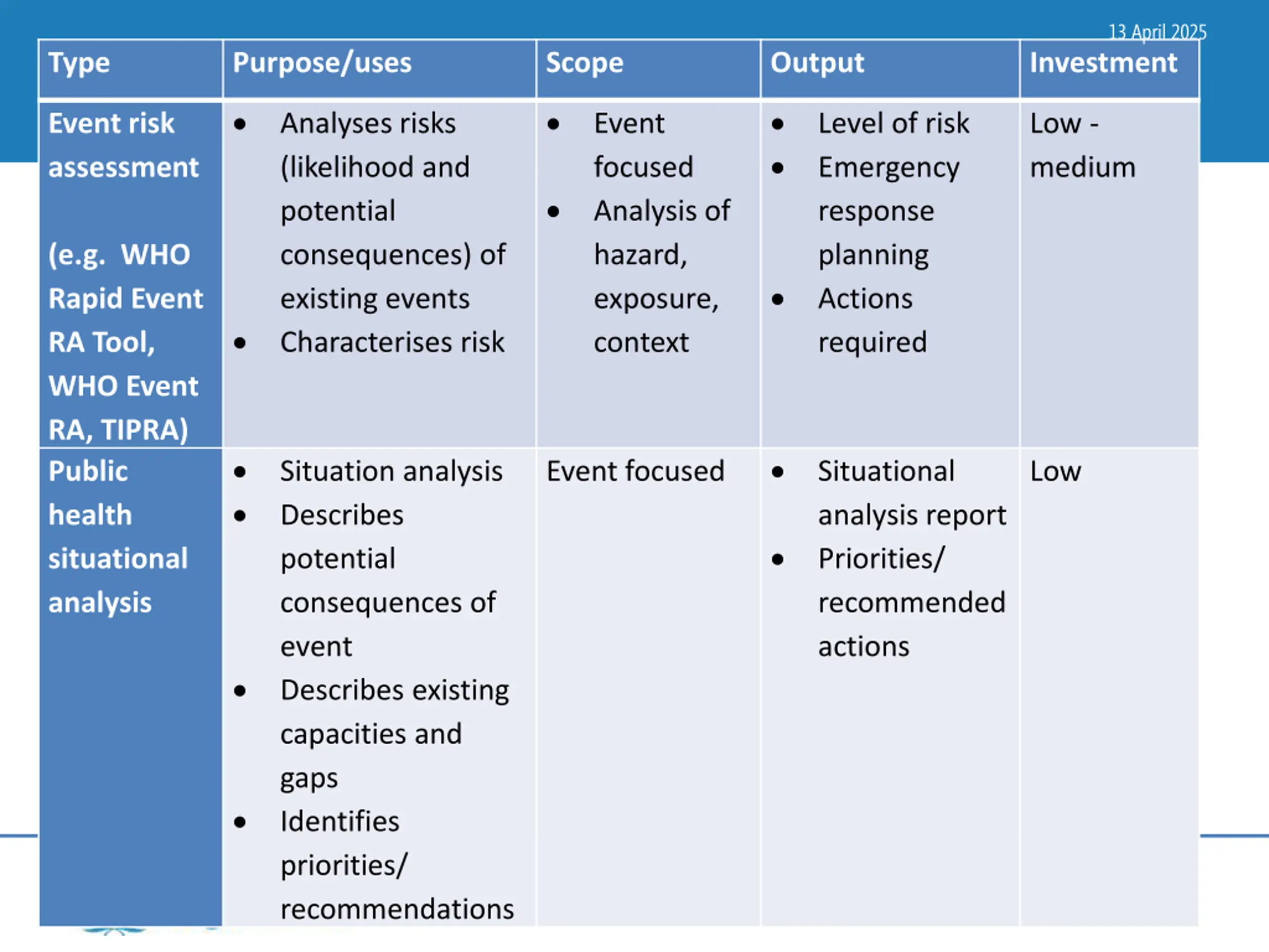 13 April 2025 Type Purpose/uses Scope Output Investment Event risk assessment Analyses risks (likelihood and potential consequences) of existing events Characterises risk Event focused Analysis of hazard, exposure, context Level of risk Emergency response planning Actions required Low - medium (e.g. WHO Rapid Event RA Tool, WHO Event RA, TIPRA) Public health situational analysis Situation analysis Describes potential consequences of event Describes existing capacities and gaps Identifies priorities/ recommendations Event focused Situational analysis report Priorities/ recommended actions Low HEALTH EMERGENCIES programme