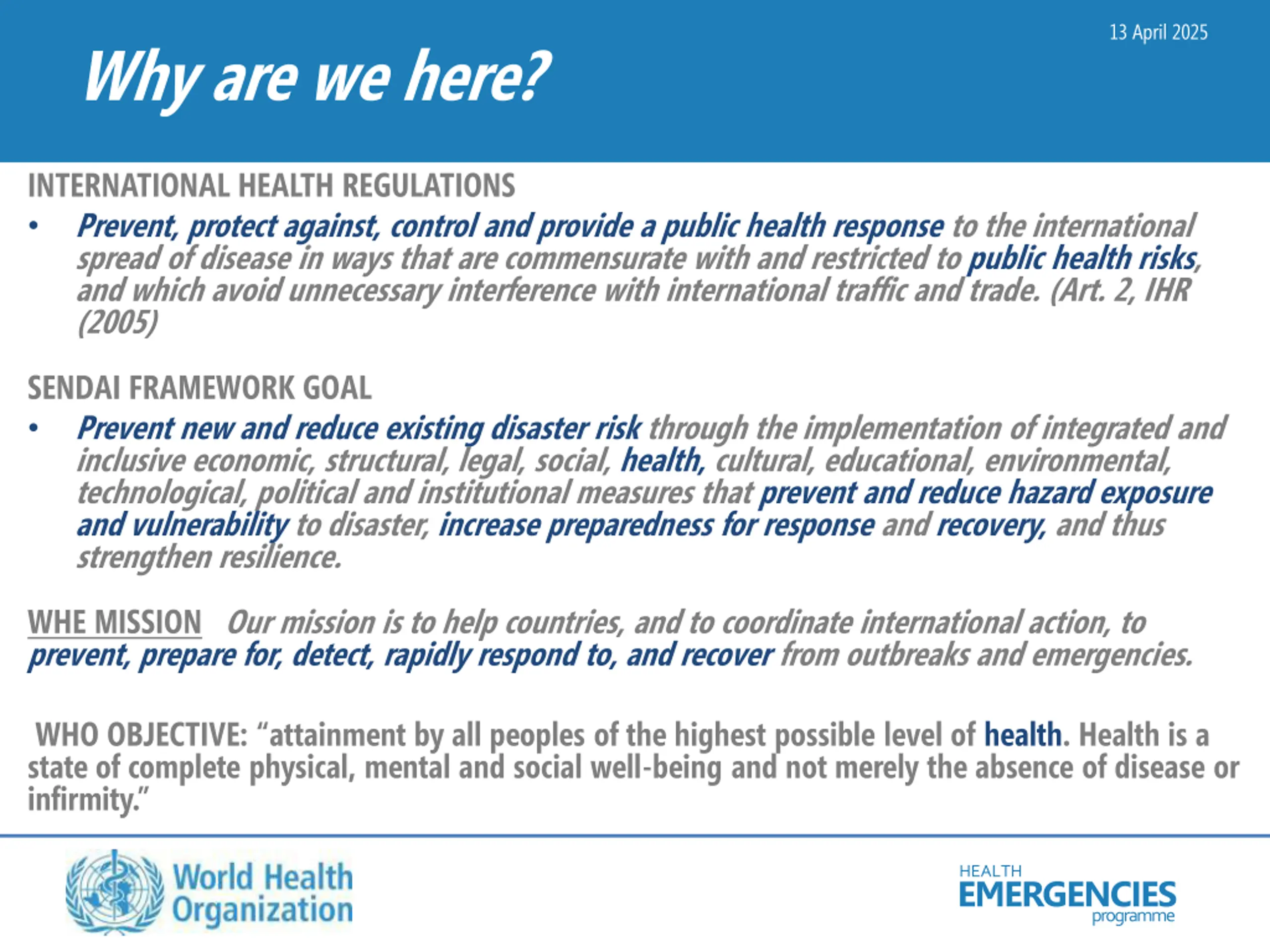 13 April 2025 Why are we here? INTERNATIONAL HEALTH REGULATIONS Prevent, protect against, control and provide a public health response to the international spread of disease in ways that are commensurate with and restricted to public health risks, and which avoid unnecessary interference with international traffic and trade. (Art. 2, IHR (2005) SENDAI FRAMEWORK GOAL Prevent new and reduce existing disaster risk through the implementation of integrated and inclusive economic, structural, legal, social, health, cultural, educational, environmental, technological, political and institutional measures that prevent and reduce hazard exposure and vulnerability to disaster, increase preparedness for response and recovery, and thus strengthen resilience. WHE MISSION Our mission is to help countries, and to coordinate international action, to prevent, prepare for, detect, rapidly respond to, and recover from outbreaks and emergencies. WHO OBJECTIVE: attainment by all peoples of the highest possible level of health. Health is a state of complete physical, mental and social well-being and not merely the absence of disease or infirmity. HEALTH EMERGENCIES programme
