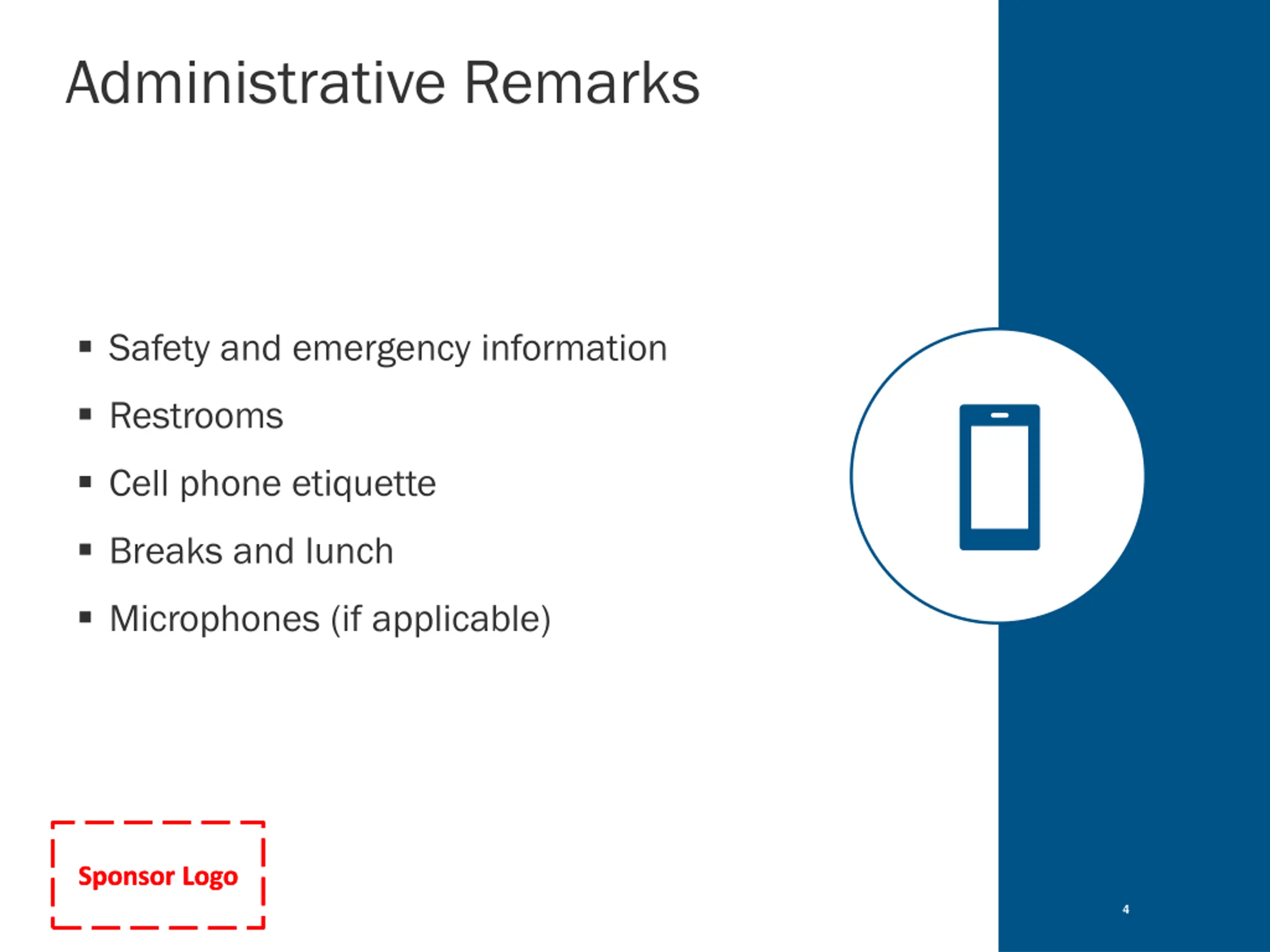 Administrative Remarks Safety and emergency information Restrooms Cell phone etiquette Breaks and lunch Microphones (if applicable) Sponsor Logo Sponsor Logo 4