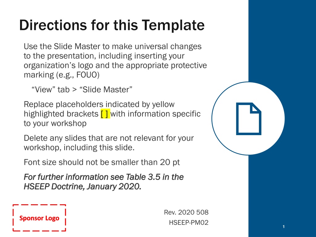 Directions for this Template Use the Slide Master to make universal changes to the presentation, including inserting your organization s logo and the appropriate protective marking (e.g., FOUO) View tab > Slide Master Replace placeholders indicated by yellow highlighted brackets [ ] [ ] with information specific to your workshop Delete any slides that are not relevant for your workshop, including this slide. Font size should not be smaller than 20 pt For further information see Table 3.5 in the For further information see Table 3.5 in the HSEEP Doctrine, January 2020. HSEEP Doctrine, January 2020. Rev. 2020 508 HSEEP-PM02 Sponsor Logo Sponsor Logo 1