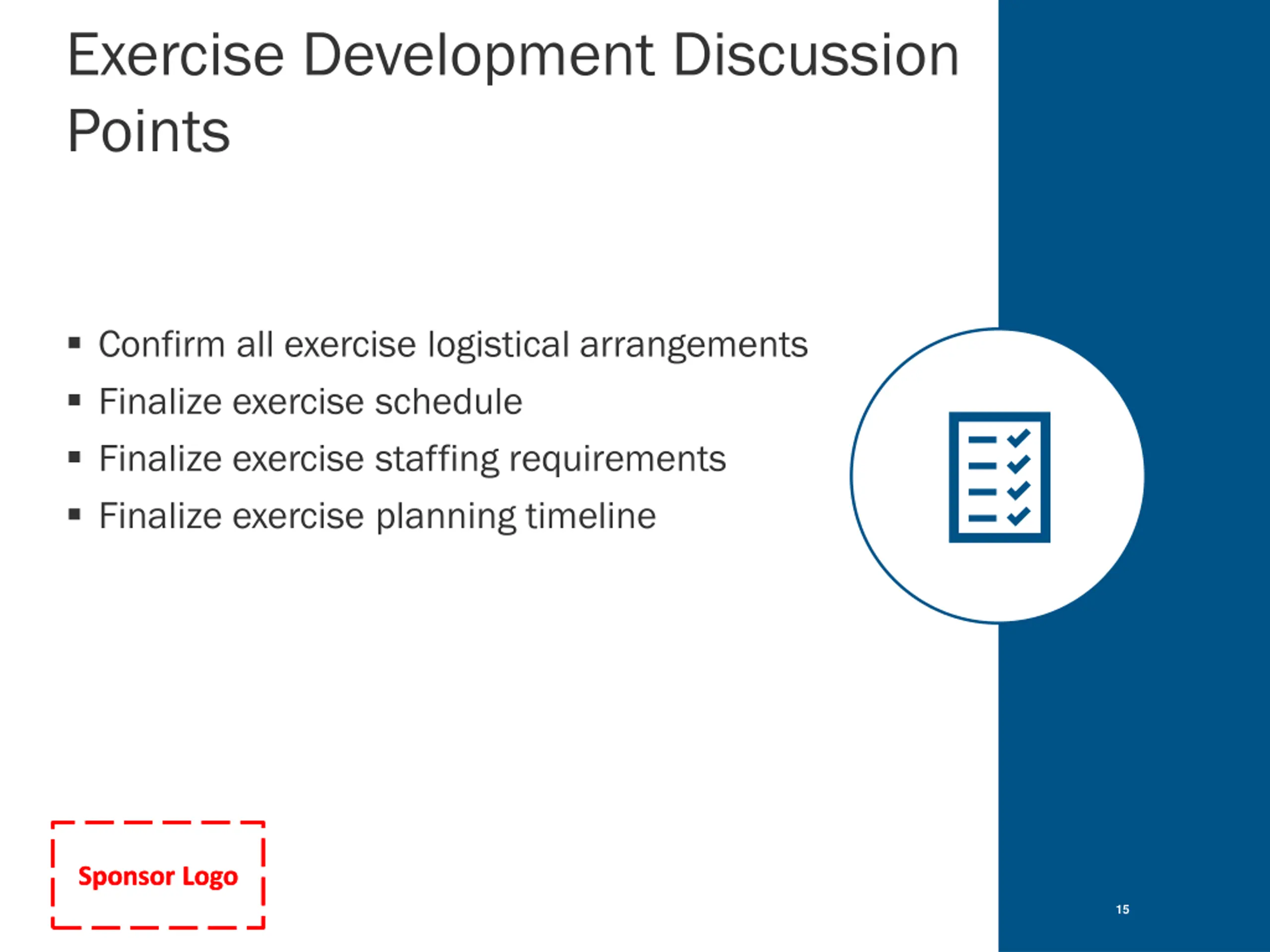 Exercise Development Discussion Points Confirm all exercise logistical arrangements Finalize exercise schedule Finalize exercise staffing requirements Finalize exercise planning timeline Sponsor Logo Sponsor Logo 15