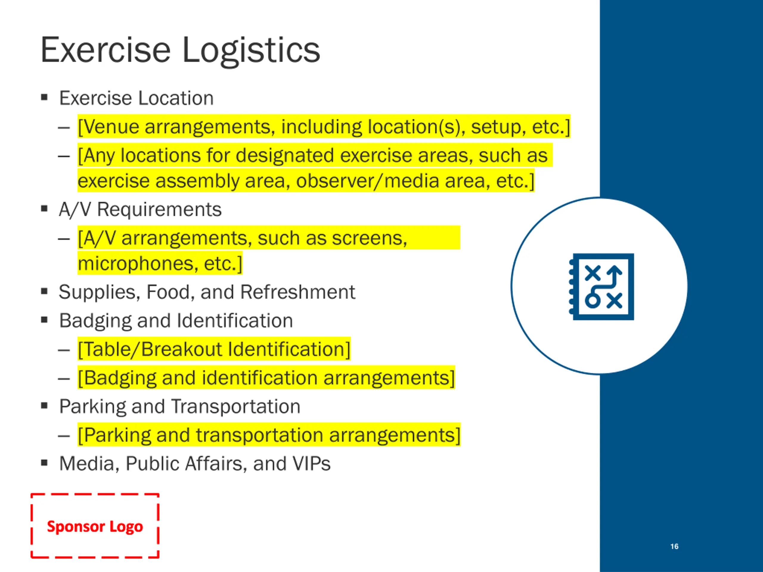 Exercise Logistics Exercise Location [Venue arrangements, including location(s), setup, etc.] [Any locations for designated exercise areas, such as exercise assembly area, observer/media area, etc.] A/V Requirements [A/V arrangements, such as screens, microphones, etc.] Supplies, Food, and Refreshment Badging and Identification [Table/Breakout Identification] [Badging and identification arrangements] Parking and Transportation [Parking and transportation arrangements] Media, Public Affairs, and VIPs Sponsor Logo Sponsor Logo 16