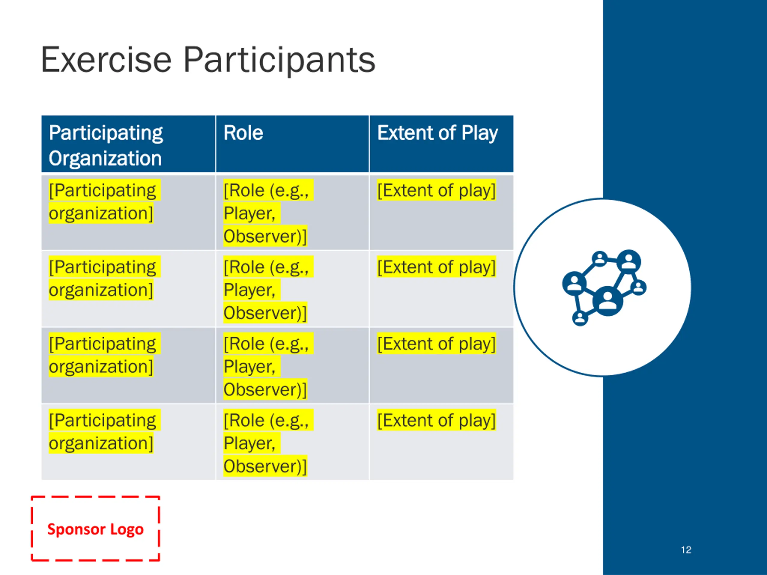 Exercise Participants Participating Participating Organization Organization [Participating organization] Role Role Extent of Play Extent of Play [Role (e.g., Player, Observer)] [Role (e.g., Player, Observer)] [Role (e.g., Player, Observer)] [Role (e.g., Player, Observer)] [Extent of play] [Participating organization] [Extent of play] [Participating organization] [Extent of play] [Participating organization] [Extent of play] Sponsor Logo 12