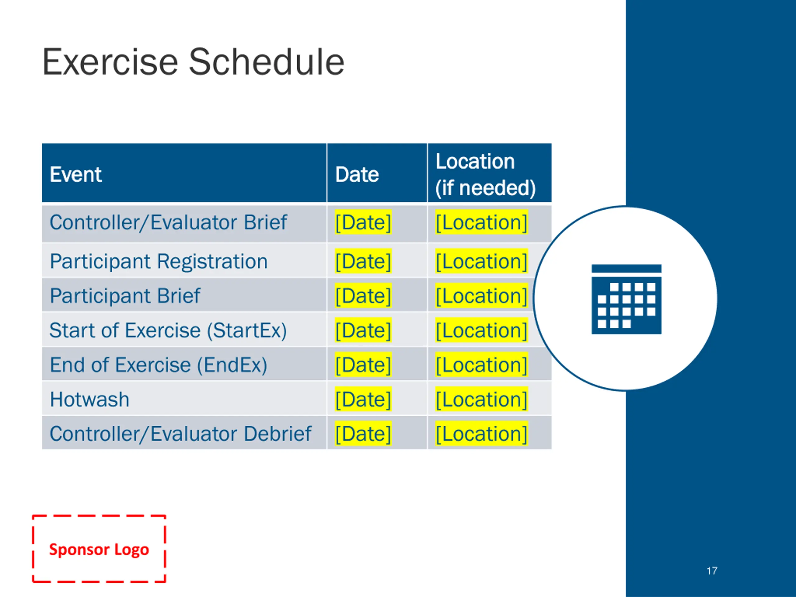 Exercise Schedule Location Location (if needed) (if needed) [Location] Event Event Date Date Controller/Evaluator Brief [Date] Participant Registration Participant Brief Start of Exercise (StartEx) End of Exercise (EndEx) Hotwash Controller/Evaluator Debrief [Date] [Date] [Date] [Date] [Date] [Date] [Location] [Location] [Location] [Location] [Location] [Location] Sponsor Logo 17
