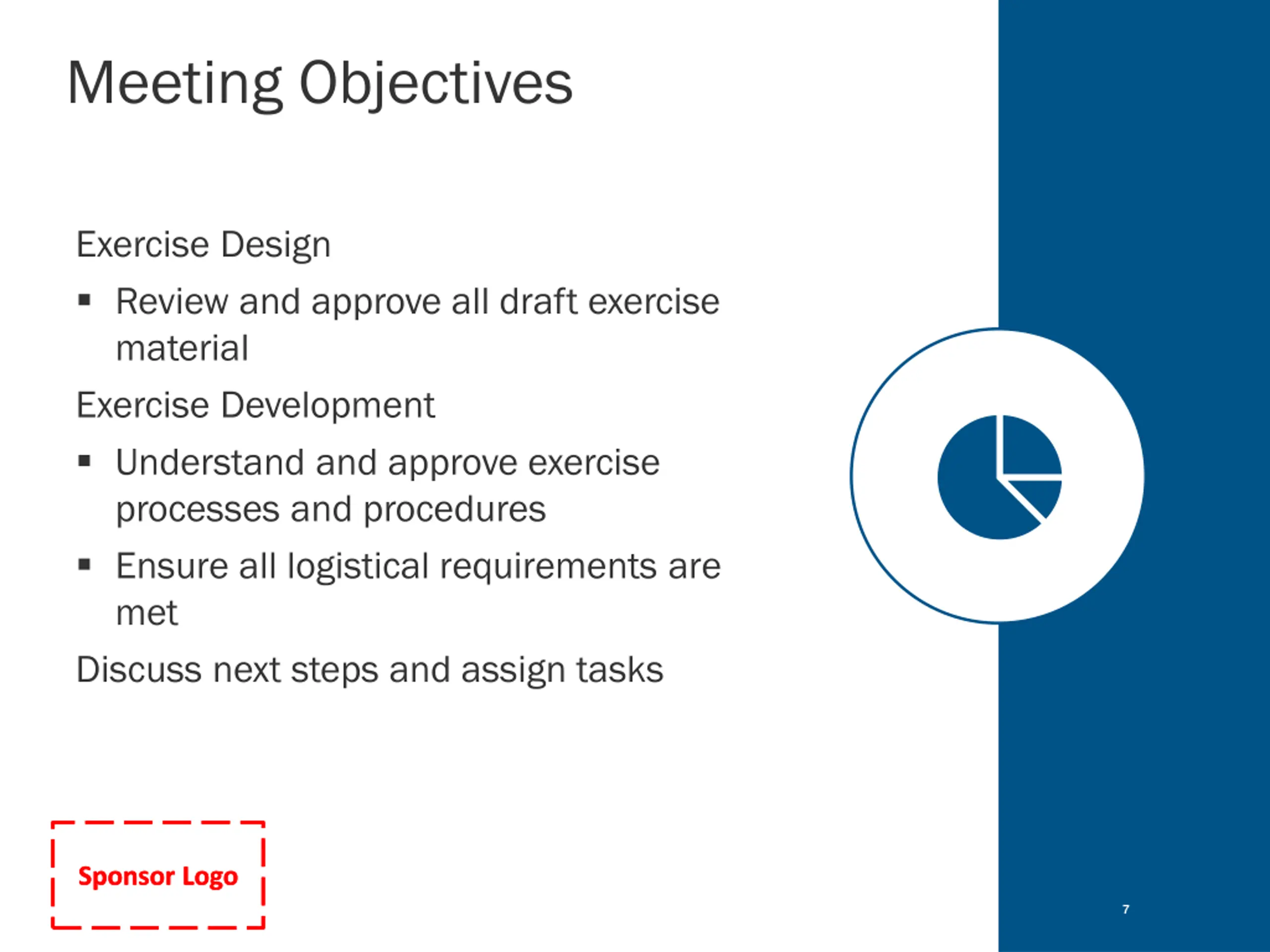 Meeting Objectives Exercise Design Review and approve all draft exercise material Exercise Development Understand and approve exercise processes and procedures Ensure all logistical requirements are met Discuss next steps and assign tasks Sponsor Logo Sponsor Logo 7