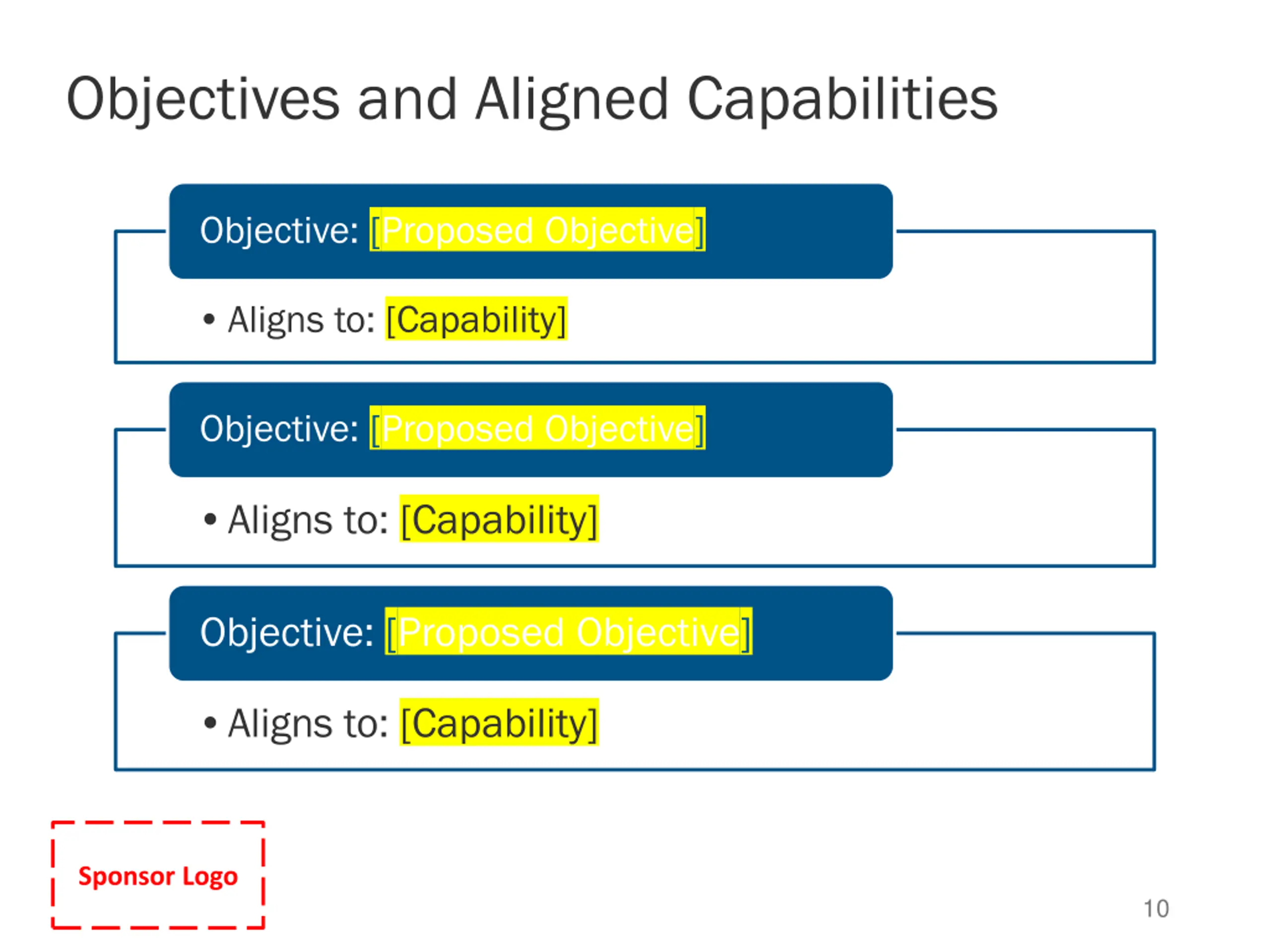 Objectives and Aligned Capabilities Objective: [Proposed Objective] Aligns to: [Capability] Objective: [Proposed Objective] Aligns to: [Capability] Objective: [Proposed Objective] Aligns to: [Capability] Sponsor Logo 10