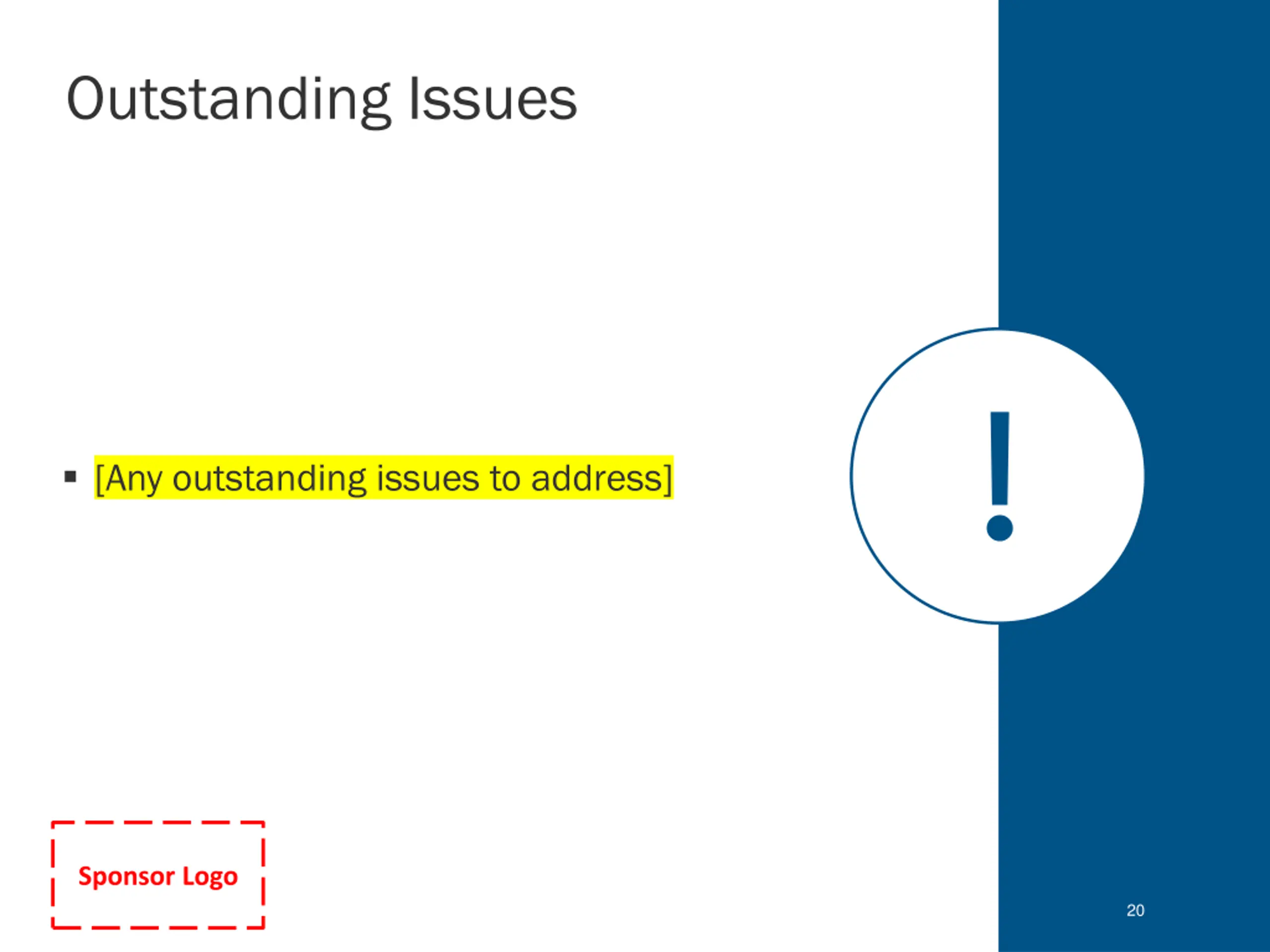 Outstanding Issues [Any outstanding issues to address] Sponsor Logo 20