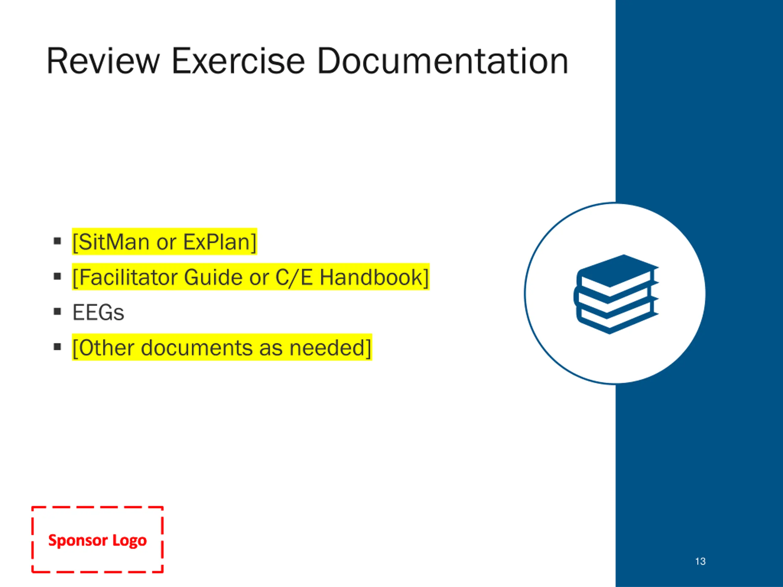 Review Exercise Documentation [SitMan or ExPlan] [Facilitator Guide or C/E Handbook] EEGs [Other documents as needed] Sponsor Logo Sponsor Logo 13